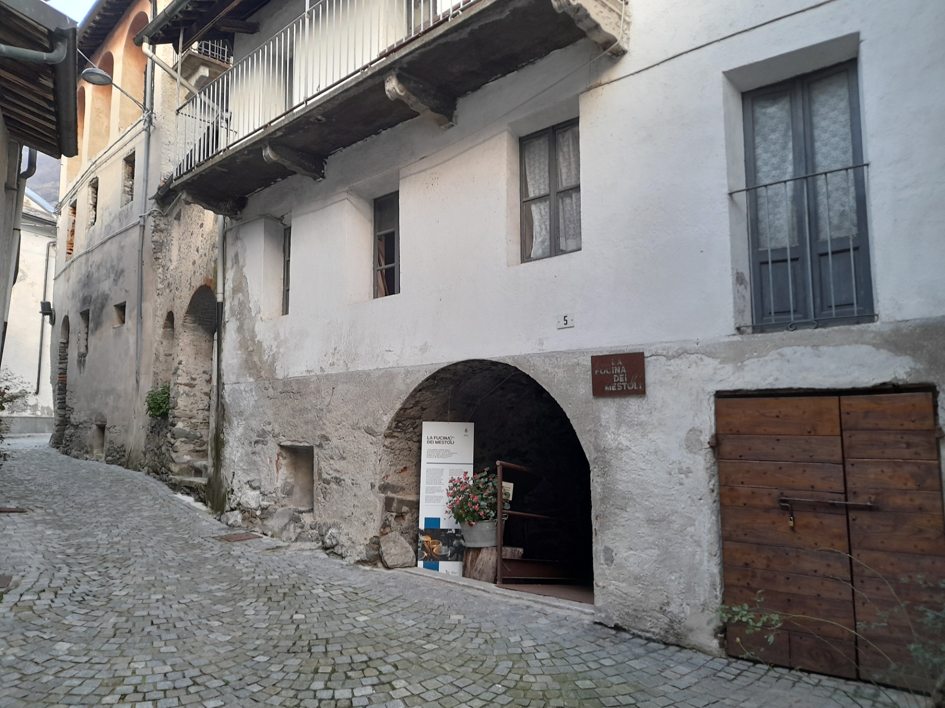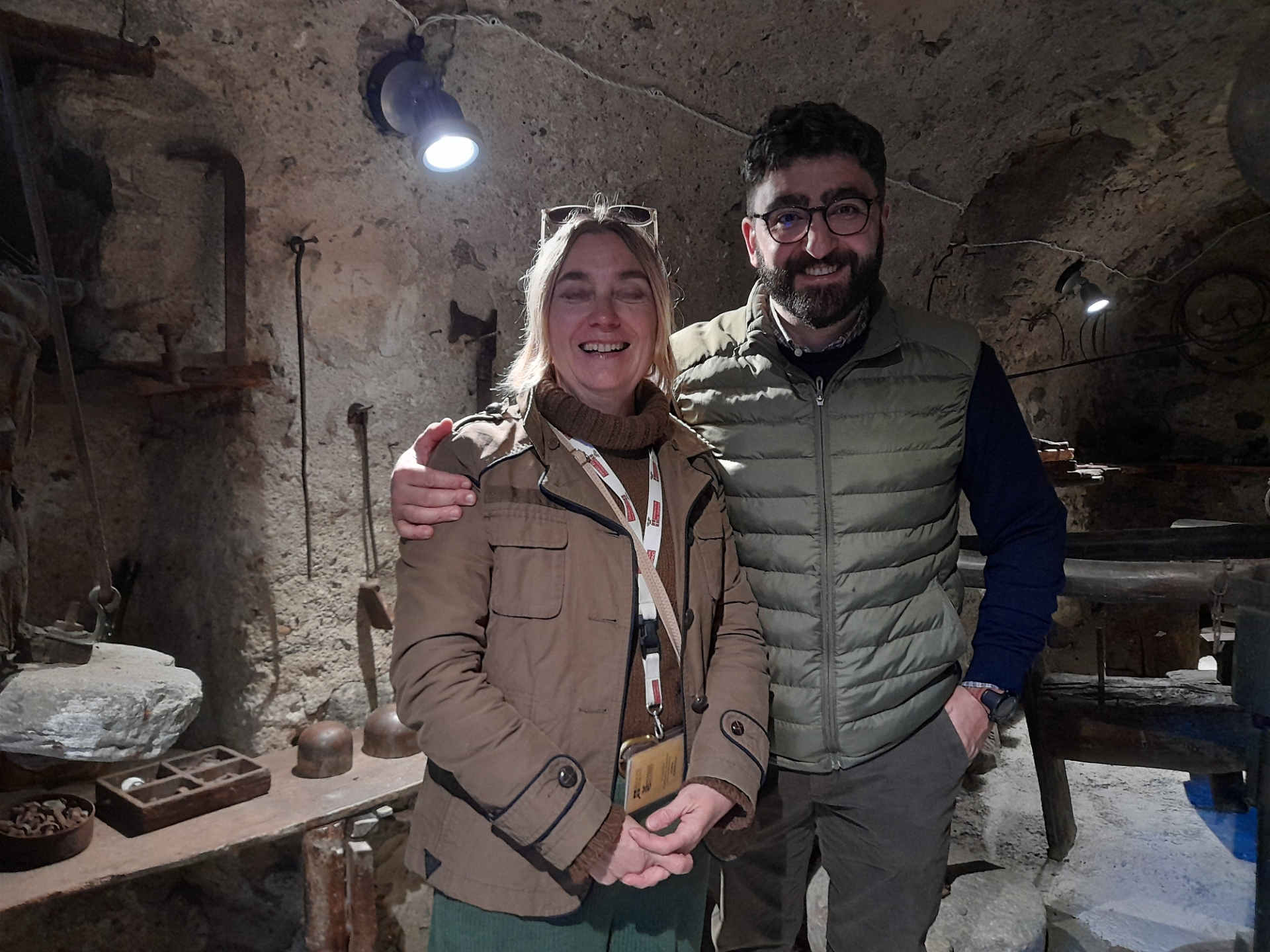 L’altro luogo che si è potuto visitare è stata la cosiddetta Fucina dei Mestoli, così chiamata perché vi si fabbricavano piccoli oggetti di uso comune come mestoli e schiumarole. Si tratta di due stanzette basse e buie, con volte a botte e murature grezze, dove attrezzi e strumenti sono stati disposti in bell’ordine in modo consono al piccolo museo che è diventata. Chi avrebbe mai detto, prima che venisse acquisita dal Comune e recuperata, che dietro quella porticina modesta, situata in un angolo della piazza della chiesa, si nascondesse una piccola officina?