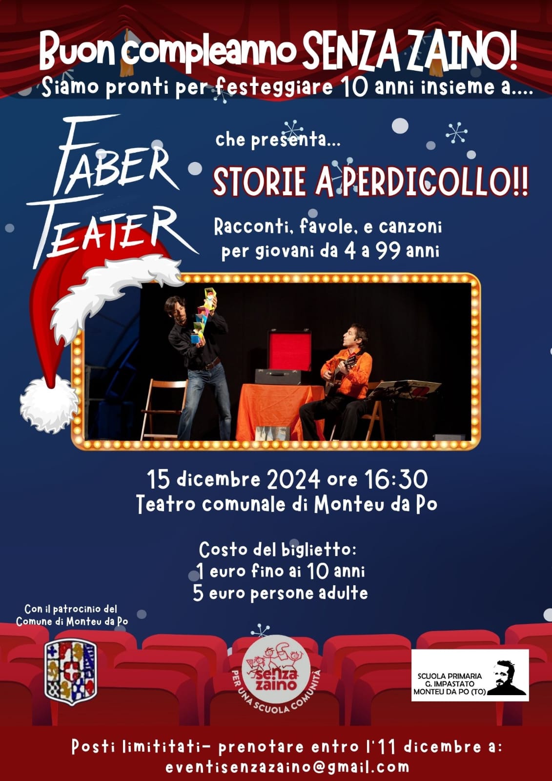Per celebrare l’anniversario, il prossimo 15 dicembre alle ore 16:30 al teatro di Monteu andrà in scena lo spettacolo per bambini “Storie a perdicollo”, a cura del Faber Teater. “Il teatro è uno strumento d’eccellenza per creare momenti d’incontro”, spiegano le insegnanti, che già lo scorso anno hanno riscosso grande successo con lo spettacolo dei Ghiss Bross. La prenotazione è possibile scrivendo a eventisenzazaino@gmail.com.