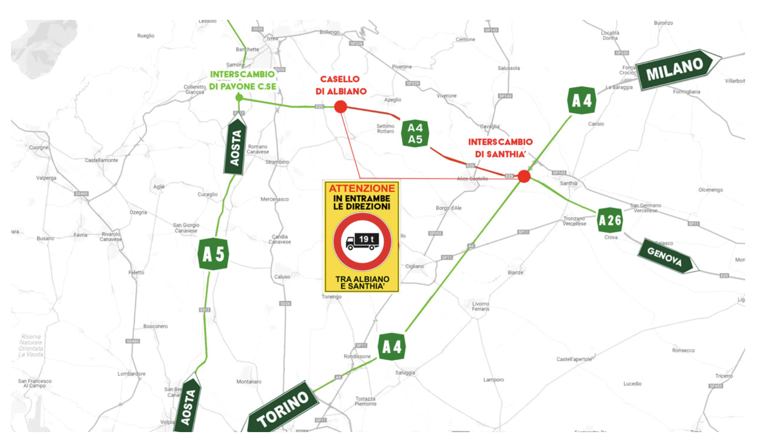 Sono inoltre previsti divieti di transito per mezzi pesanti e autobus in entrambi i sensi di marcia, tra gli interscambi di Pavone e Santhià, oltre a restringimenti temporanei su svincoli chiave, come quello di Albiano e l’interscambio di Santhià, per reindirizzare i mezzi pesanti verso percorsi alternativi.