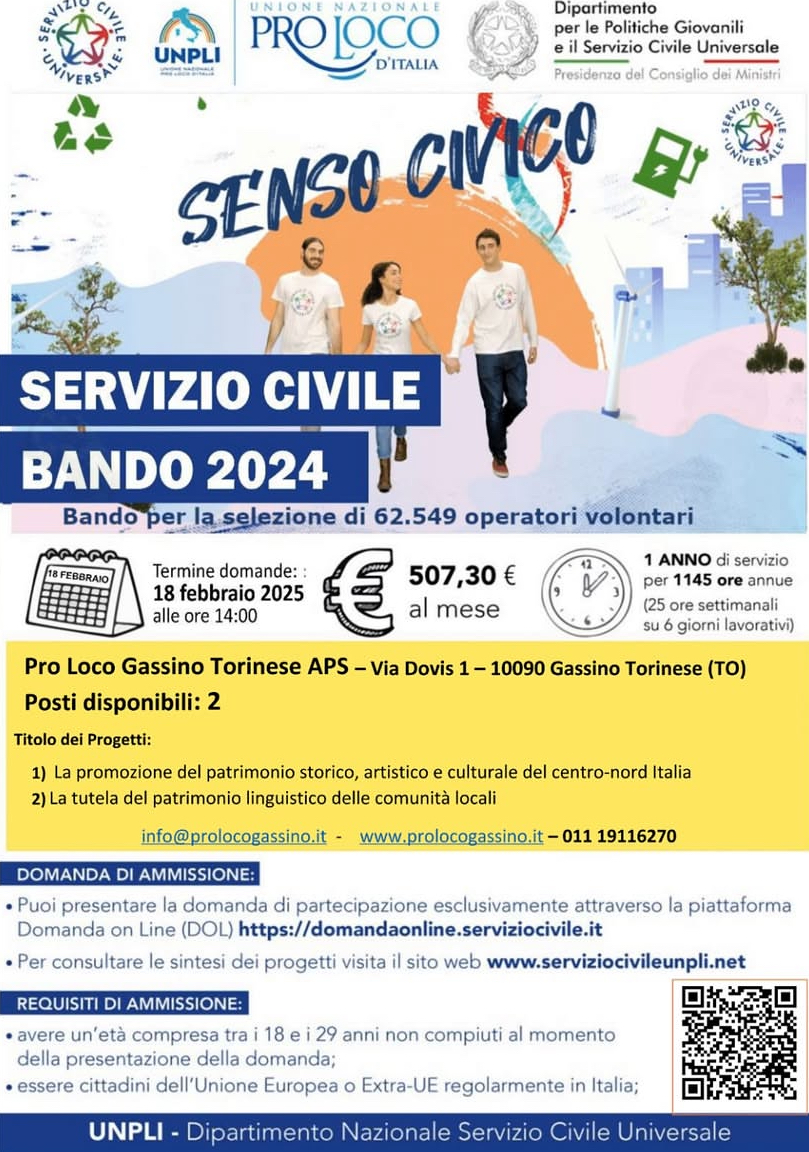 La Pro Loco di Gassino Torinese, in collaborazione con l’Unione Nazionale Pro Loco d’Italia (UNPLI), ha ufficialmente aperto il bando per il Servizio Civile Universale 2025, offrendo un’opportunità unica ai giovani interessati a contribuire alla tutela e valorizzazione del patrimonio storico, culturale e linguistico del territorio. Con sede in via Dovis 1, sotto ai portici, il progetto offre due posti per candidati di età compresa tra i 18 e i 28 anni, in possesso di diploma di scuola superiore.