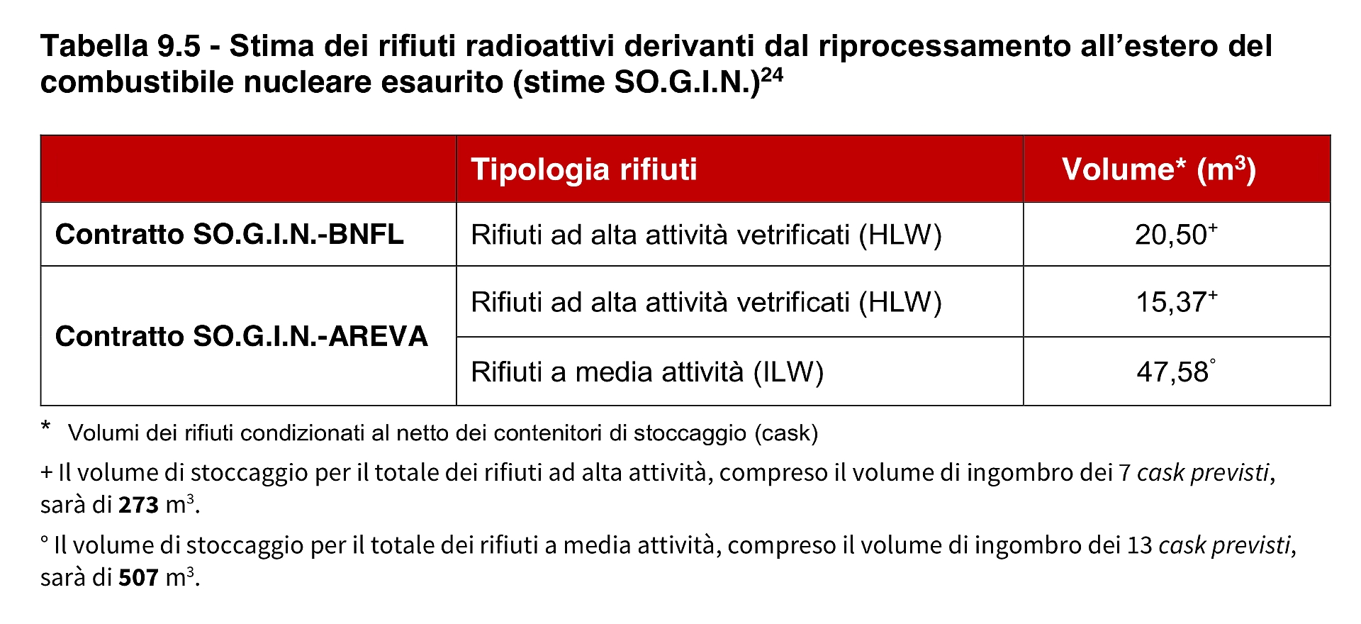 Frattanto, mentre i tempi si allungano e i costi aumentano (la famosa “eredità nucleare” è questo: spese enormi, a carico della collettività, ed enormi problemi ambientali e di sicurezza), si pone con urgenza il problema del rientro del materiale radioattivo italiano inviato in altri Paesi europei. Gran parte degli elementi di combustibile irraggiato utilizzato nei reattori nucleari italiani è stato infatti inviato all'estero (all'impianto inglese di Sellafield e a quello francese di La Hague, ma prima anche alla belga Eurochemic) per il “ritrattamento” o “riprocessamento”, operazione che separa la parte eventualmente riutilizzabile (anche per usi militari) dai veri e propri rifiuti radioattivi; questi ultimi, secondo i contratti stipulati, devono rientrare in Italia già da quest'anno, 2025. Rifiuti che costituiscono il 99% (2 miliardi di miliardi di Becquerel) della radioattività prodotta dalle centrali nucleari italiane.