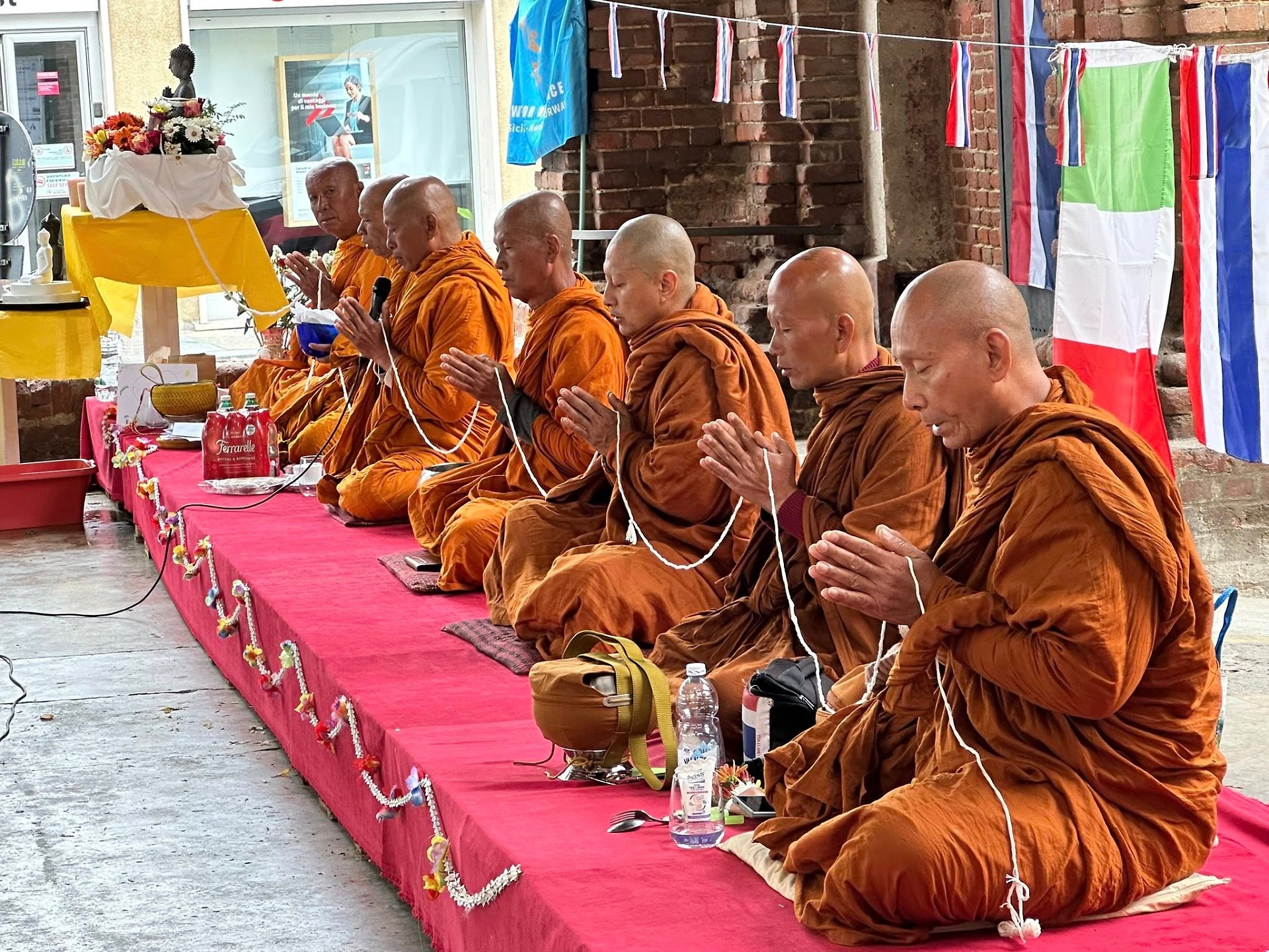Il momento centrale della celebrazione è stato il Tak Bat, l’offerta del cibo ai monaci. In Tailandia è un rito quotidiano: i monaci, che non possono cucinare né toccare denaro, camminano per i villaggi con la loro ciotola alla ricerca della generosità dei laici.