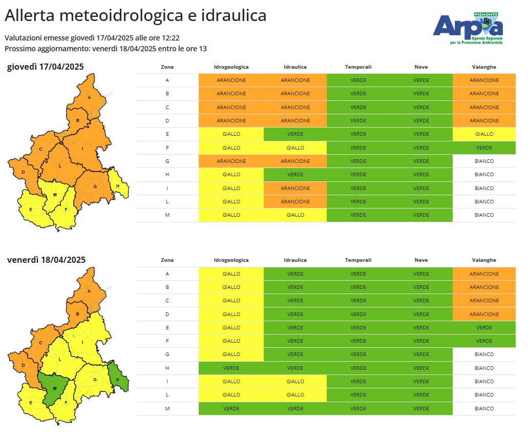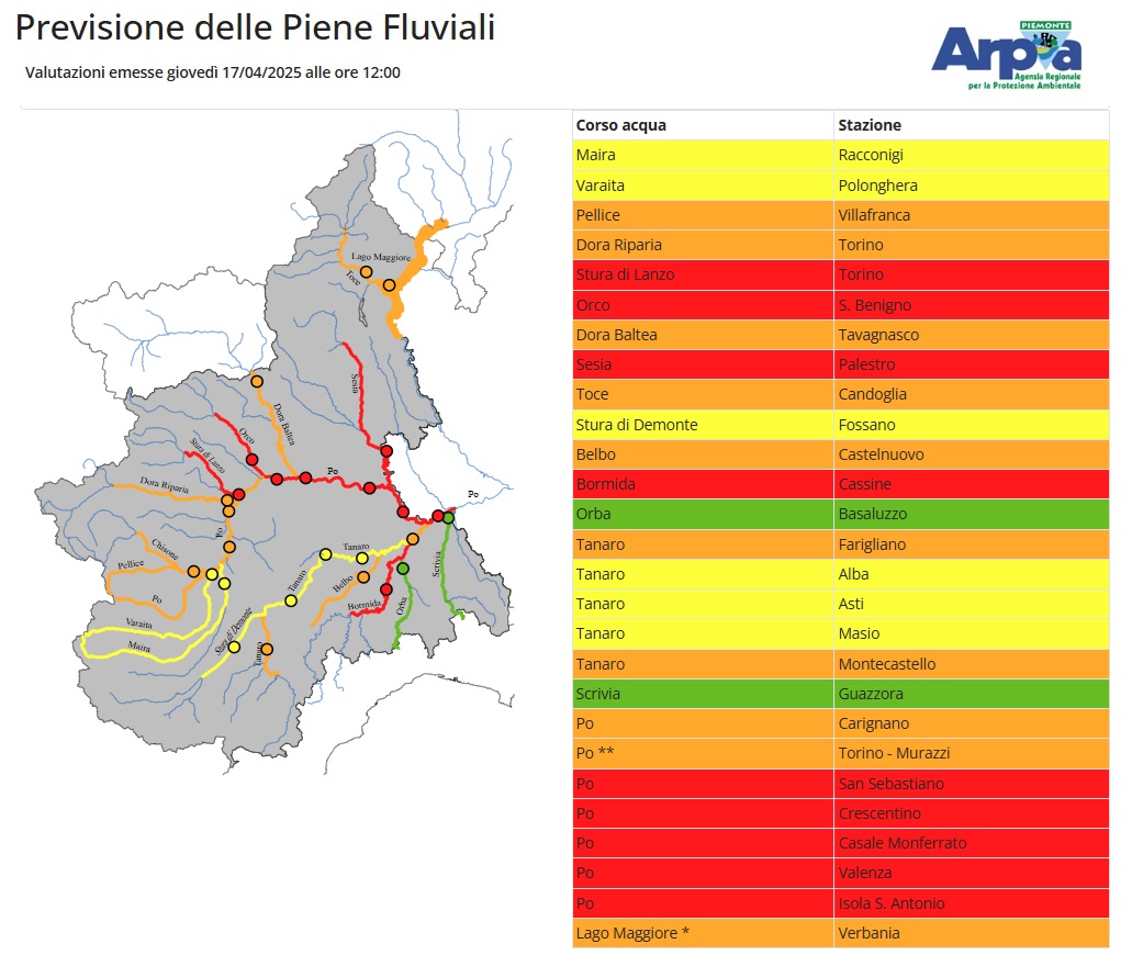 Nel frattempo, i fiumi continuano a preoccupare. L’Orco a San Benigno, il Malone a Front e la Stura di Lanzo a Torino si mantengono sopra la soglia di pericolo, mentre la Dora Riparia e la Dora Baltea hanno superato i livelli di guardia e risultano ancora in crescita. Il Po, già oltre il livello di pericolo tra Castiglione Torinese e Crescentino, è in crescita anche a valle, con criticità elevata attesa fino a Isola S. Antonio, dove il colmo di piena dovrebbe transitare domani pomeriggio.