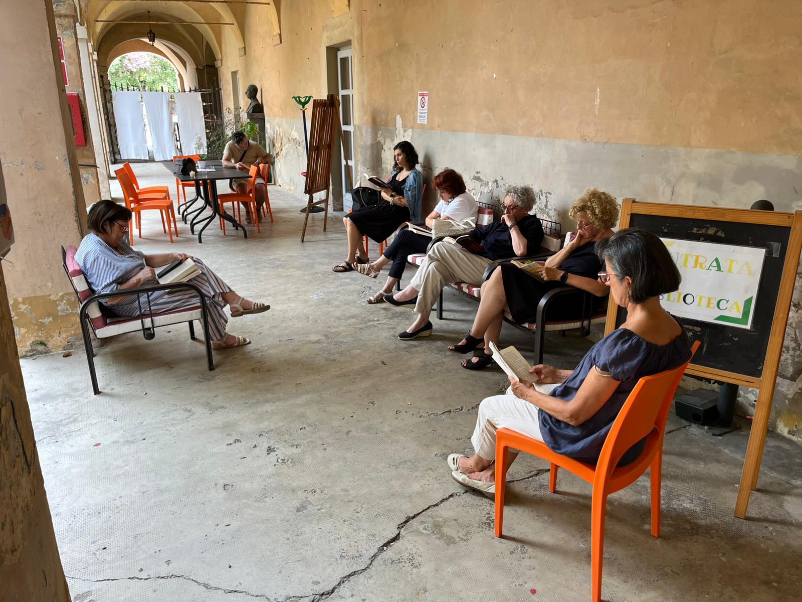Curiosa anche la disposizione degli spazi: chi leggeva era all’esterno, sotto gli archi della biblioteca, mentre chi scriveva restava all’interno. Una scelta voluta, simbolica, a sottolineare il percorso che porta una parola scritta a diventare racconto condiviso.