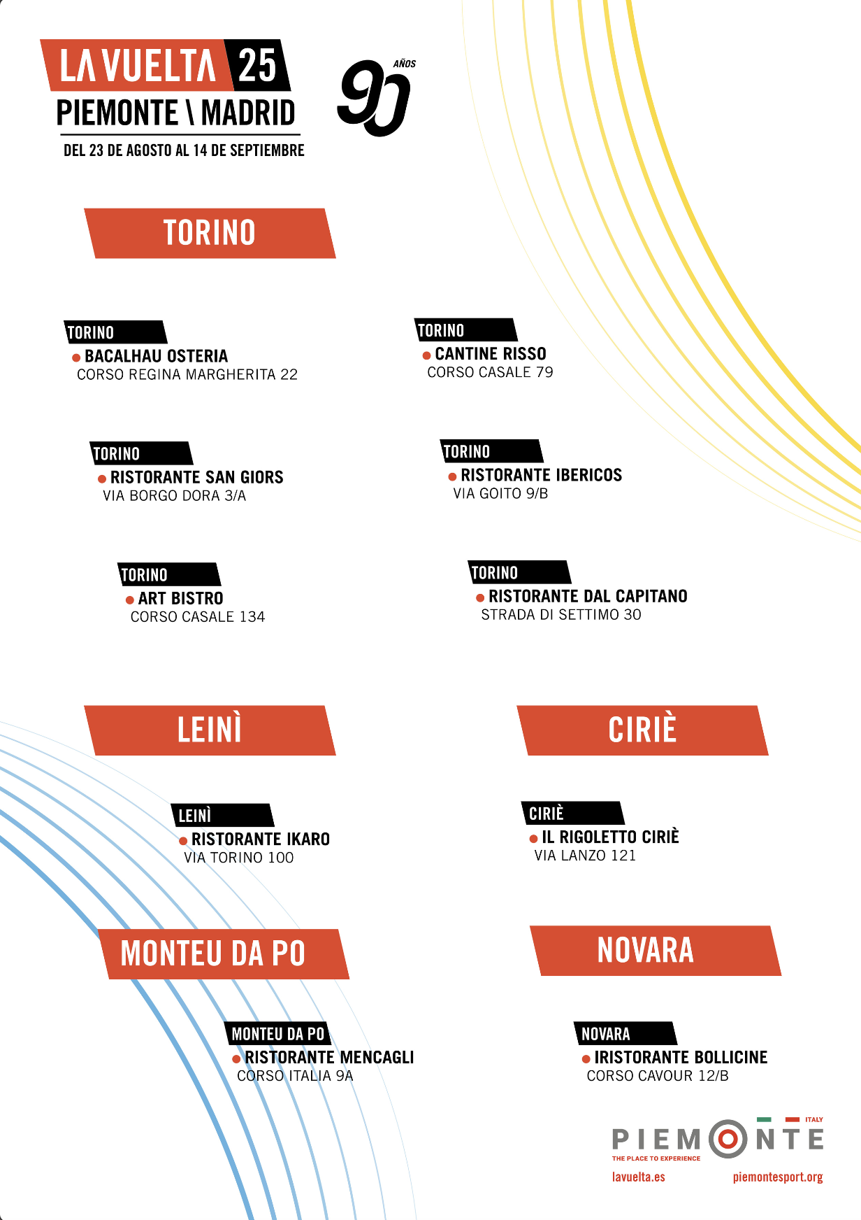 Durante le tre settimane di gara e festeggiamenti, numerosi ristoranti piemontesi proporranno piatti ispirati al menù ufficiale, rendendo omaggio al gemellaggio enogastronomico tra Piemonte e Spagna.