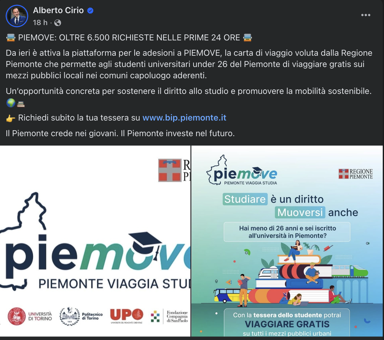Sulla vicenda è intervenuto anche il presidente della Regione Alberto Cirio, che attraverso i suoi canali social ha esaltato il risultato: « Piemove: oltre 6.500 richieste nelle prime 24 ore. Da ieri è attiva la piattaforma per le adesioni a Piemove, la carta di viaggio voluta dalla Regione Piemonte che permette agli studenti universitari under 26 del Piemonte di viaggiare gratis sui mezzi pubblici locali nei comuni capoluogo aderenti. Un’opportunità concreta per sostenere il diritto allo studio e promuovere la mobilità sostenibile. Richiedi subito la tua tessera su www.bip.piemonte.it Il Piemonte crede nei giovani. Il Piemonte investe nel futuro.»