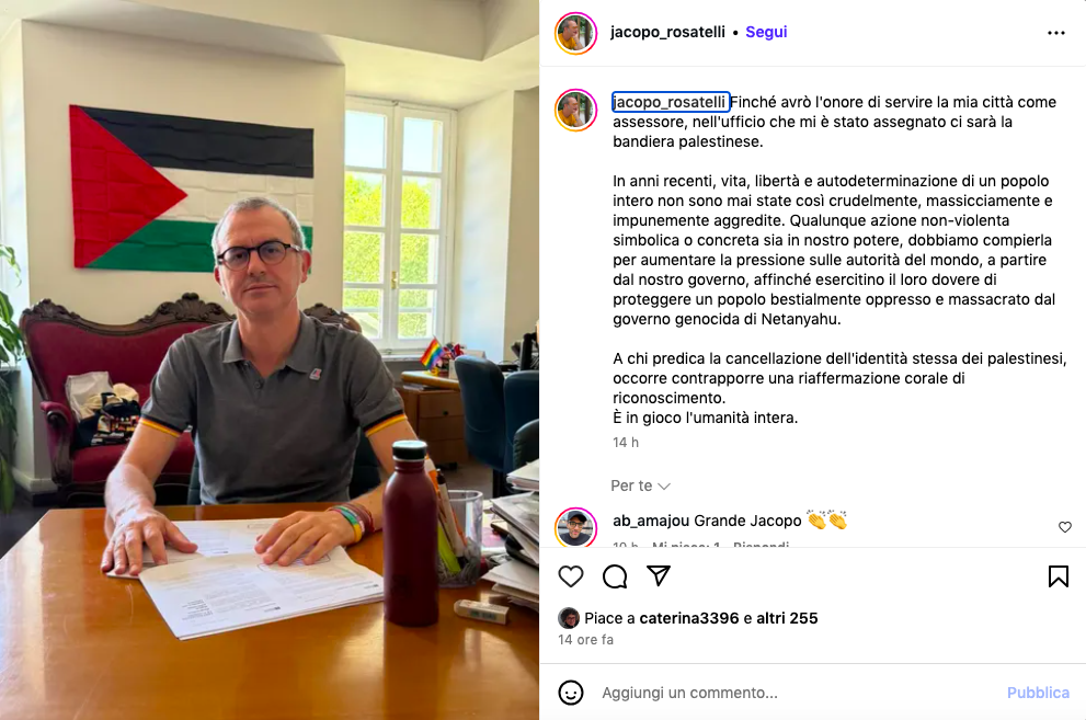 “Finché avrò l'onore di servire la mia città – scrive Rosatelli suInstagram – nell'ufficio che mi è stato assegnato ci sarà la bandiera palestinese”. L’assessore, che non ha mai nascosto le sue posizioni pro Gaza, motiva così la scelta: “In anni recenti vita, libertà e autodeterminazione di un popolo intero non sono mai state così crudelmente, massicciamente e impunemente aggredite”. Nel mirino il governo guidato da Benjamin Netanyahu, definito “genocida”. Da qui l’appello all’azione: “Qualunque azione non-violenta, simbolica o concreta, sia in nostro potere, dobbiamo compierla per aumentare la pressione sulle autorità del mondo, a partire dal nostro governo, affinché esercitino il loro dovere di proteggere un popolo bestialmente oppresso e massacrato”. E un messaggio rivolto a militanti e cittadini: “A chi predica la cancellazione dell'identità stessa dei palestinesi, occorre contrapporre una riaffermazione corale di riconoscimento. È in gioco l'umanità intera”.