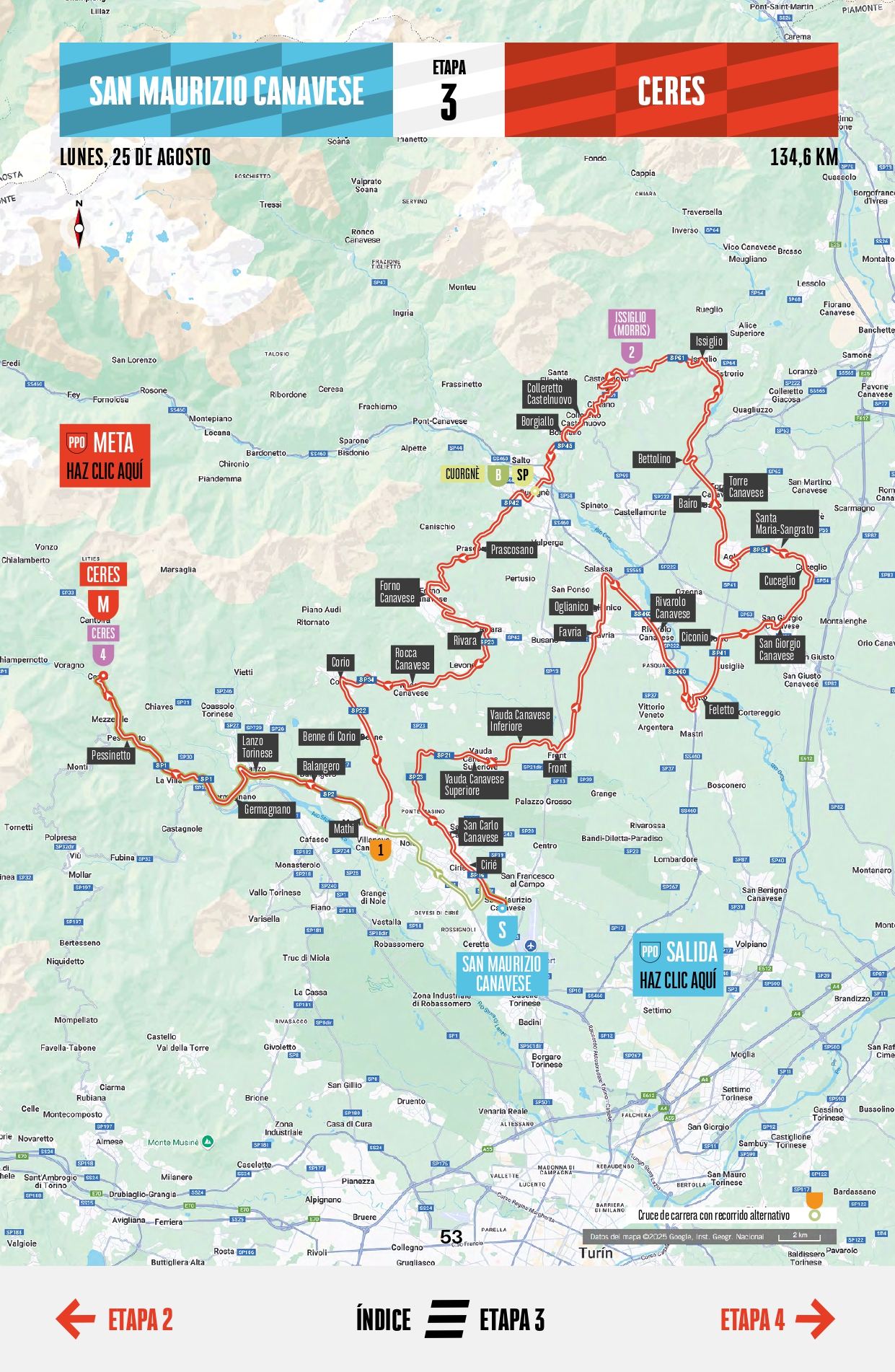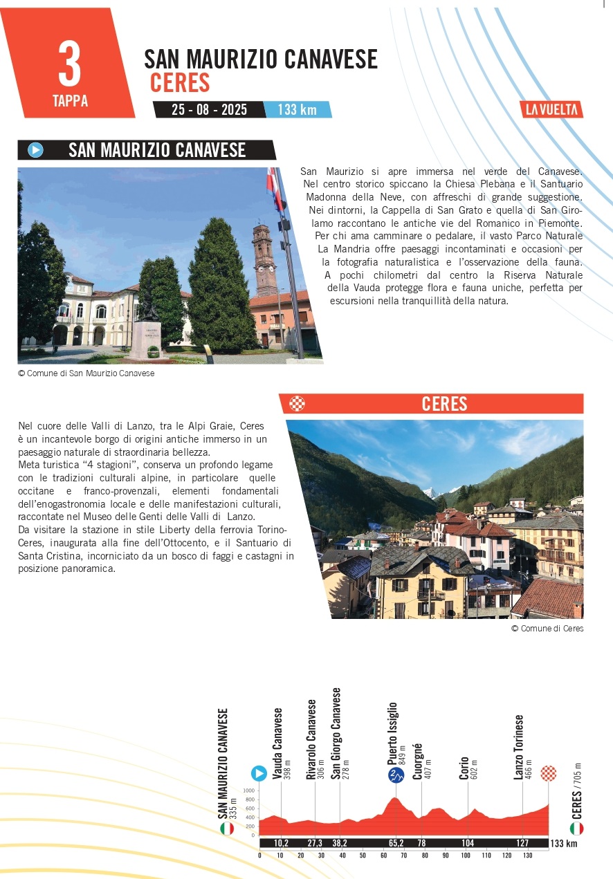 La Vuelta a España 2025 entra nel vivo con la terza tappa di lunedì 25 agosto, 139 chilometri da San Maurizio Canavese a Ceres, un percorso che intreccia la storia, le tradizioni e i paesaggi del Piemonte settentrionale.