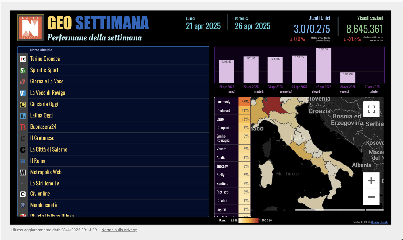 I numeri già parlano chiaro: nel solo mese di aprile 2025 il Consorzio Nasce ha superato i 17 milioni di utenti unici e ha sfiorato i 44 milioni di pagine viste. Nell’ultima settimana del mese, oltre 3 milioni di utenti unici e 8,6 milioni di pagine viste. Non sono statistiche vuote, ma la prova che c’è ancora fame di informazione seria, di notizie raccontate da chi conosce i territori e li vive ogni giorno. È la dimostrazione che i giornali locali, se messi in rete, diventano un gigante capace di farsi sentire a livello nazionale senza perdere il contatto con le proprie comunità.