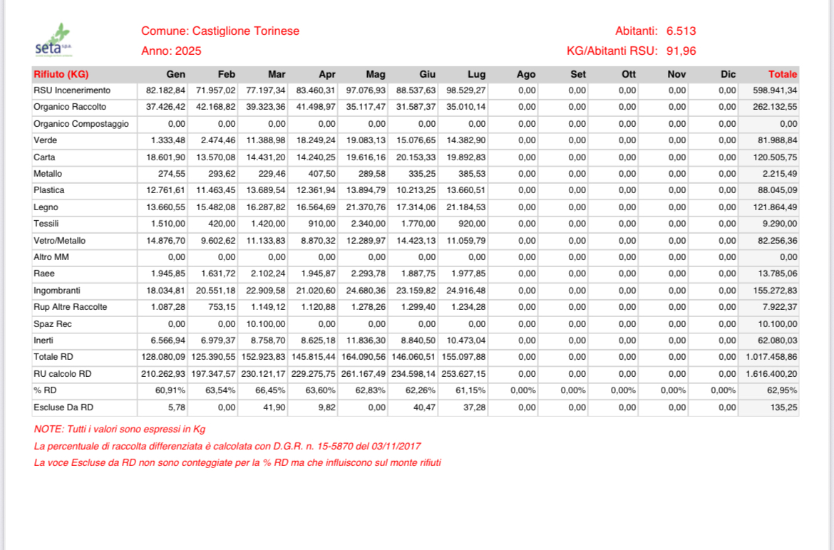 I dati ufficiali sulla gestione rifiuti confermano l’impegno, ma anche le criticità. Nel 2025 a Castiglione Torinese sono stati raccolti complessivamente 1.616.400 chili di rifiuti, con una percentuale di raccolta differenziata al 62,95%.