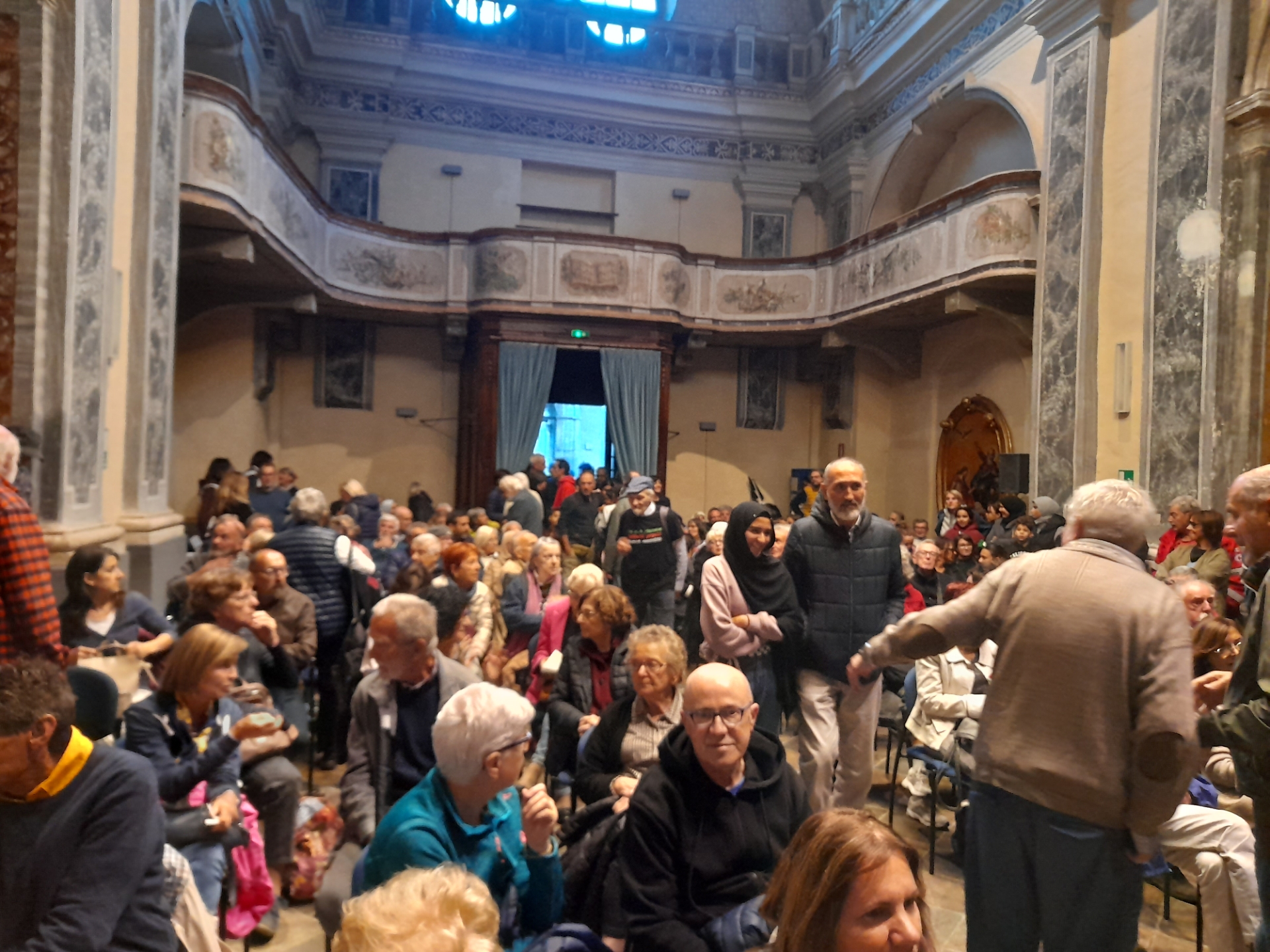 Molto netta la posizione di Nino Boeti: “Quello che è successo ieri nei confronti della Flottilla è un atto di pirateria: se c’è un popolo proprietario di quel tratto di mare è il popolo palestinese. L’atteggiamento della nostra presidente del consiglio non è accettabile: ha rimandato in Libia un criminale di guerra con un volo di stato ed oggi vuol far pagare agli attivisti della Flottilla il biglietto aereo per rientrare in Italia!”. Un lungo e caloroso applauso ha accompagnato questa dichiarazione. Boeti ha proseguito mettendo a confronto due tragedie avvenute in tempi e luoghi differenti (nel 1943 a Roma e nel 2025 nella Striscia di Gaza) e che hanno visto coinvolti un ebreo ed una palestinese. “La dottoressa Ala al-Najjar ha perso in un bombardamento israeliano otto dei suoi nove figli ed il marito. Anche Settimio Calò aveva nove figli. Il 16 ottobre 1943, giorno della grande retata dei nazisti nel Ghetto di Roma, era uscito per comprare le sigarette. Al ritorno trovò la casa vuota. Nessuno dei suoi cari, deportati ad Auschwitz, tornò a casa. Tra loro non c’è differenza”. Boeti è scettico sulla possibilità che il Piano di Pace di Trump si concretizzi anche se si augura che questo avvenga.