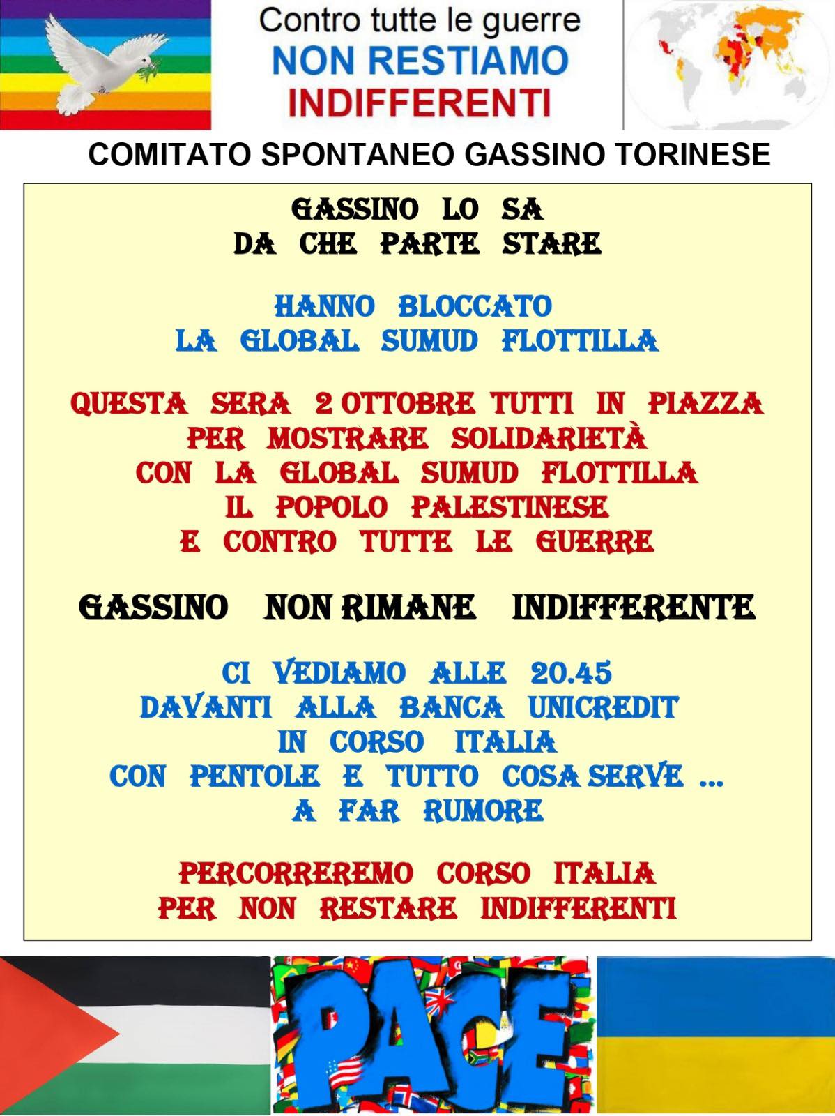 Gassino Torinese non si volta dall'altra parte, ma scende in piazza in nome della pace. Giovedì scorso, alcune decine di cittadini hanno preso parte a una manifestazione pacifica e simbolica nel centro, unendosi alle numerose piazze italiane che tra venerdì e sabato si sono tinte di rosso, nero, verde e bianco: i colori della Palestina.