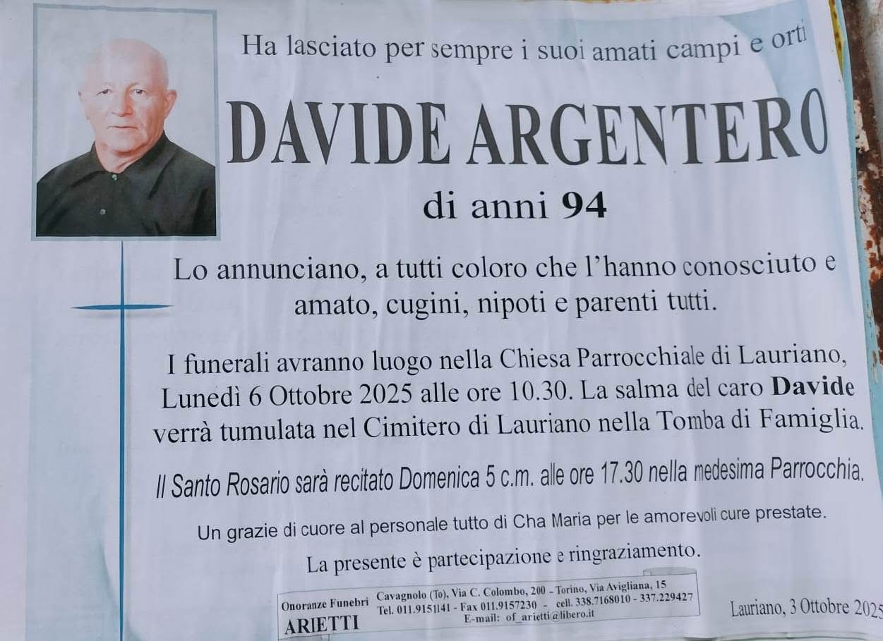 Pochi giorni dopo, un altro lutto ha colpito Lauriano: Davide Argentero, 94 anni, è “andato via lasciando i suoi amati campi e orti”, come recita l’annuncio funebre.