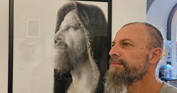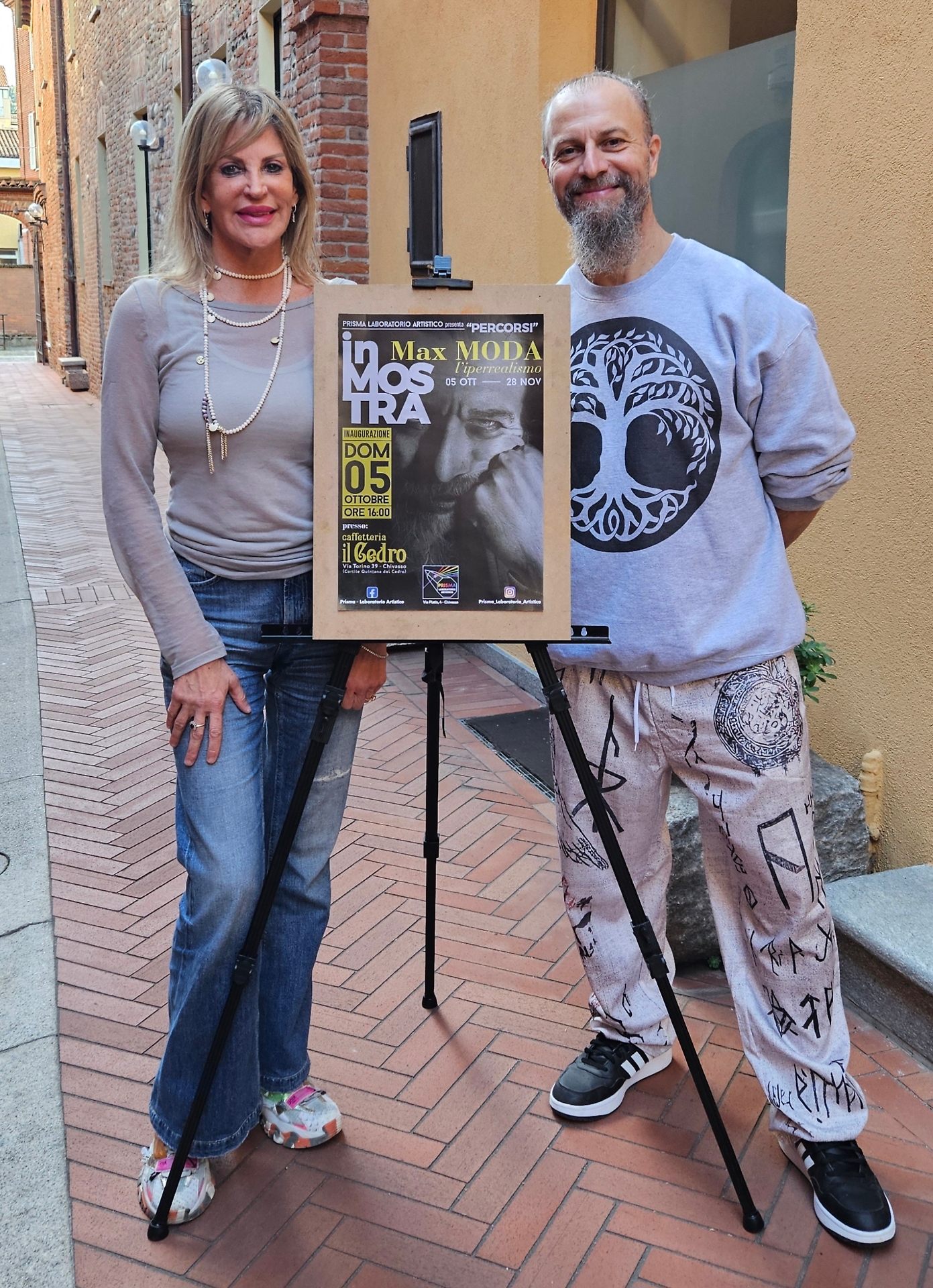 Max Moda e uno dei suoi disegni in mostra