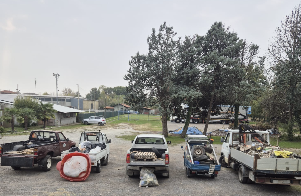 I mezzi privati dei volontari, carichi di rifiuti rimossi durante la giornata di pulizia. Ogni intervento restituisce decoro e respiro al territorio di Mazzè.