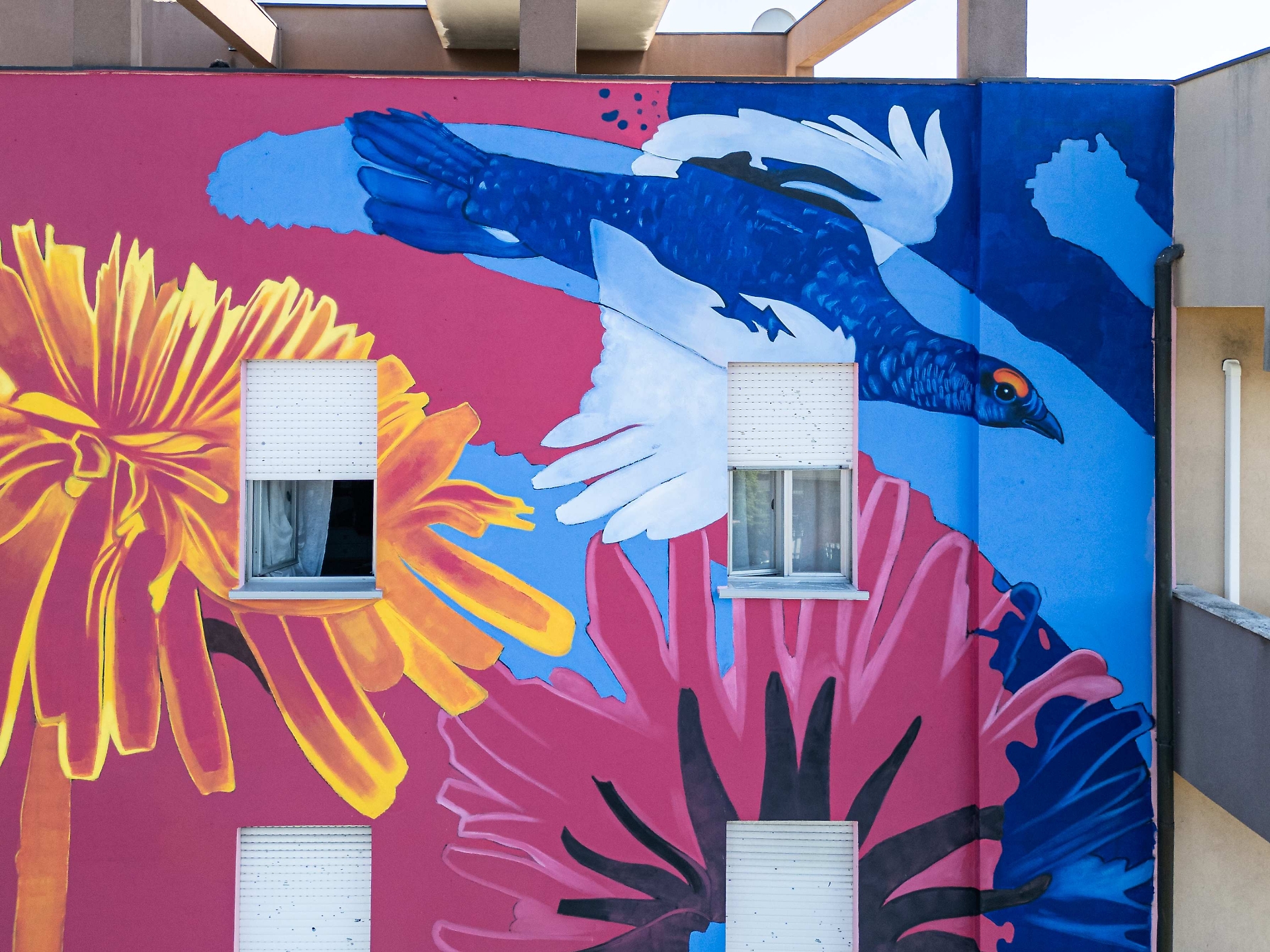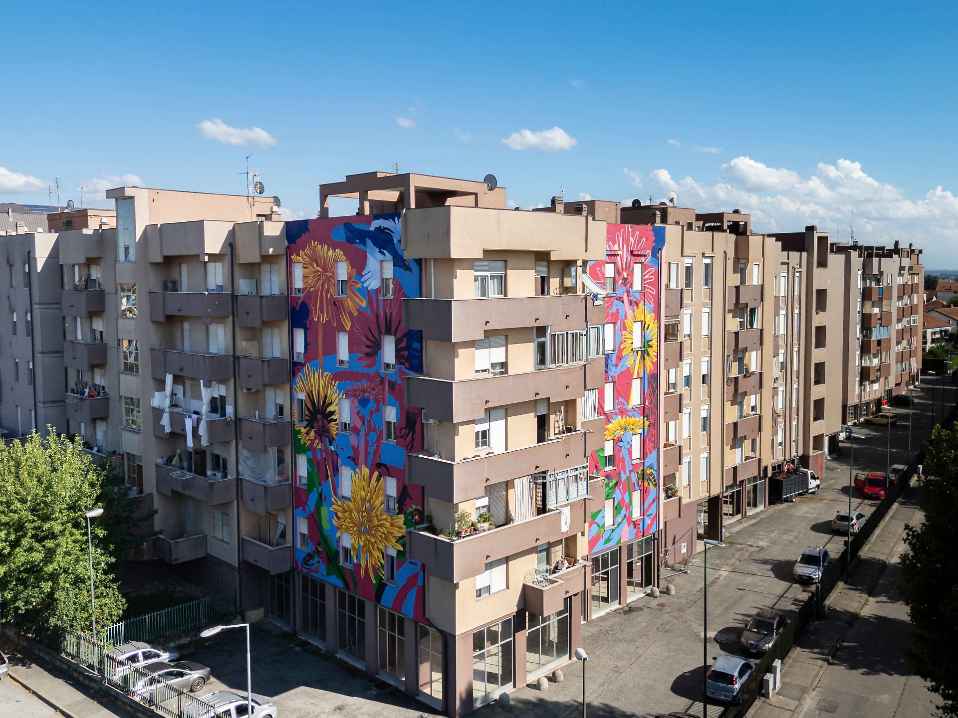Gli interventi hanno interessato le facciate nord e ovest dell’edificio, dove è stata realizzata un’opera di street art dell’artista Mario Primiano De Stefani, in arte Mario Jin, ispirata ai temi della natura e della sostenibilità ambientale. L’obiettivo non era soltanto estetico: attraverso il linguaggio dell’arte pubblica, si è voluto restituire dignità e identità a un quartiere popolare che negli anni aveva sofferto il degrado e l’abbandono.