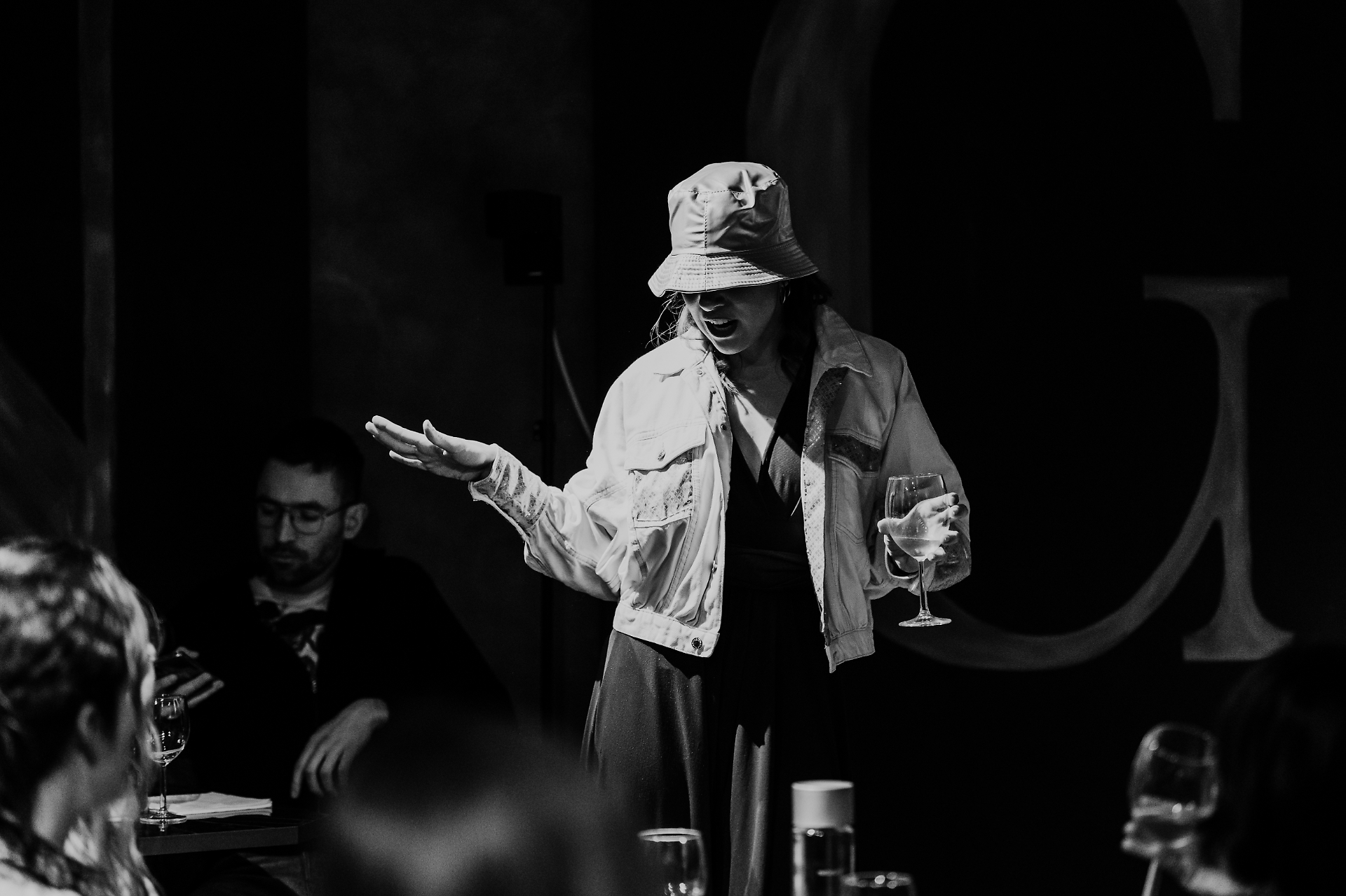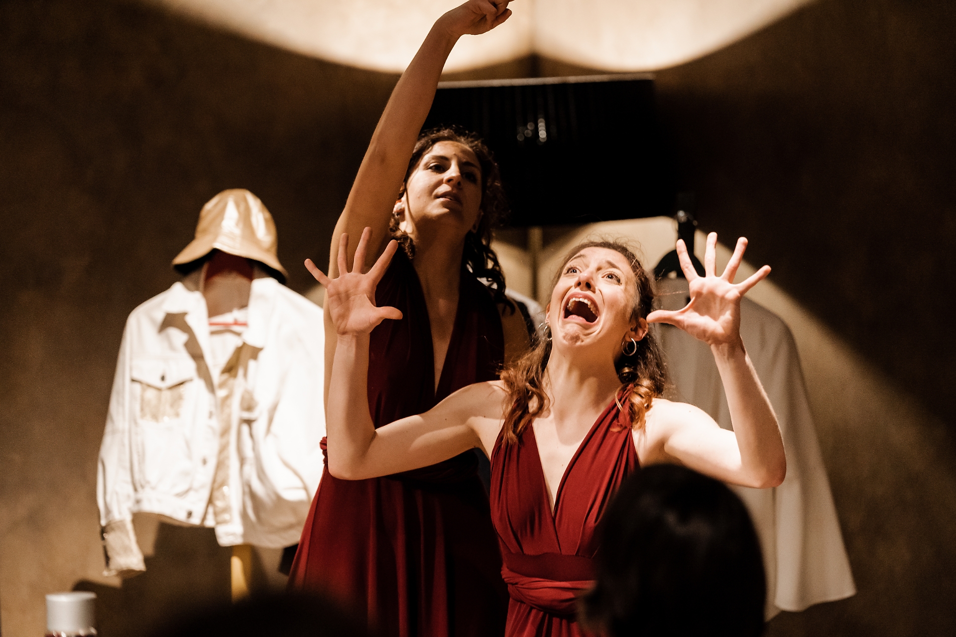Non c’è quarta parete, non c’è confine. Le attrici si muovono tra i tavoli, si siedono accanto a te, ti chiedono: “Tu che vino saresti?”