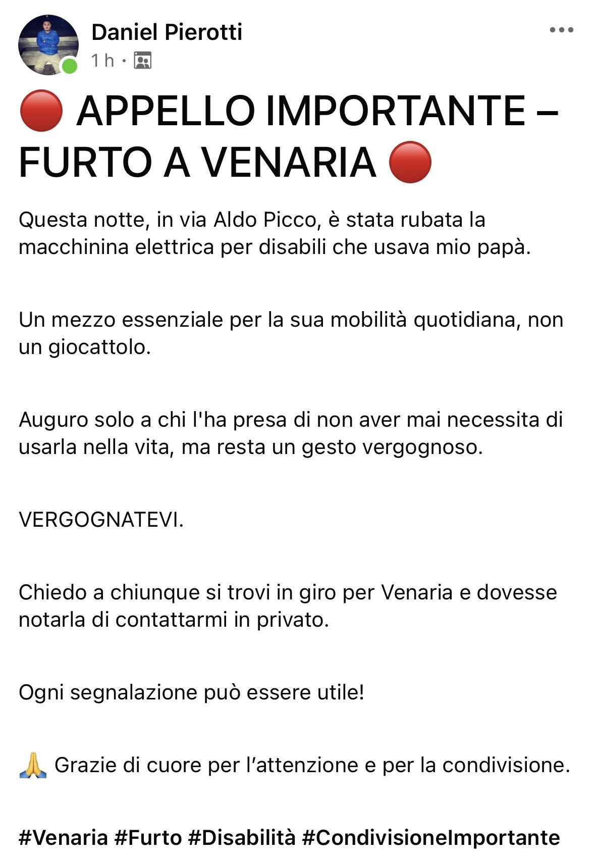 Il post, pubblicato nella mattinata di ieri, si è rapidamente diffuso sui social, raccogliendo centinaia di condivisioni e messaggi di solidarietà. Con tono composto ma carico di amarezza, Pierotti racconta l’accaduto: «Questa notte, in via Aldo Picco, è stata rubata la macchinina elettrica per disabili che usava mio papà. Un mezzo essenziale per la sua mobilità quotidiana, non un giocattolo».