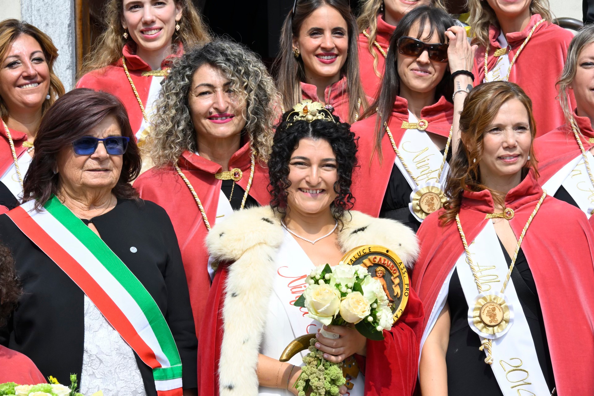 Il momento della celebrazione della nuova Ninfa Albaluce 2025: in primo piano, da sinistra a destra, il Sindaco Maria Rosa Cena, la nuova Ninfa Arianna Sanna e la Presidente dell'Ordine delle Ninfe Albaluce di Caluso Marta Salvetti. Foto di Mauro Minetti.