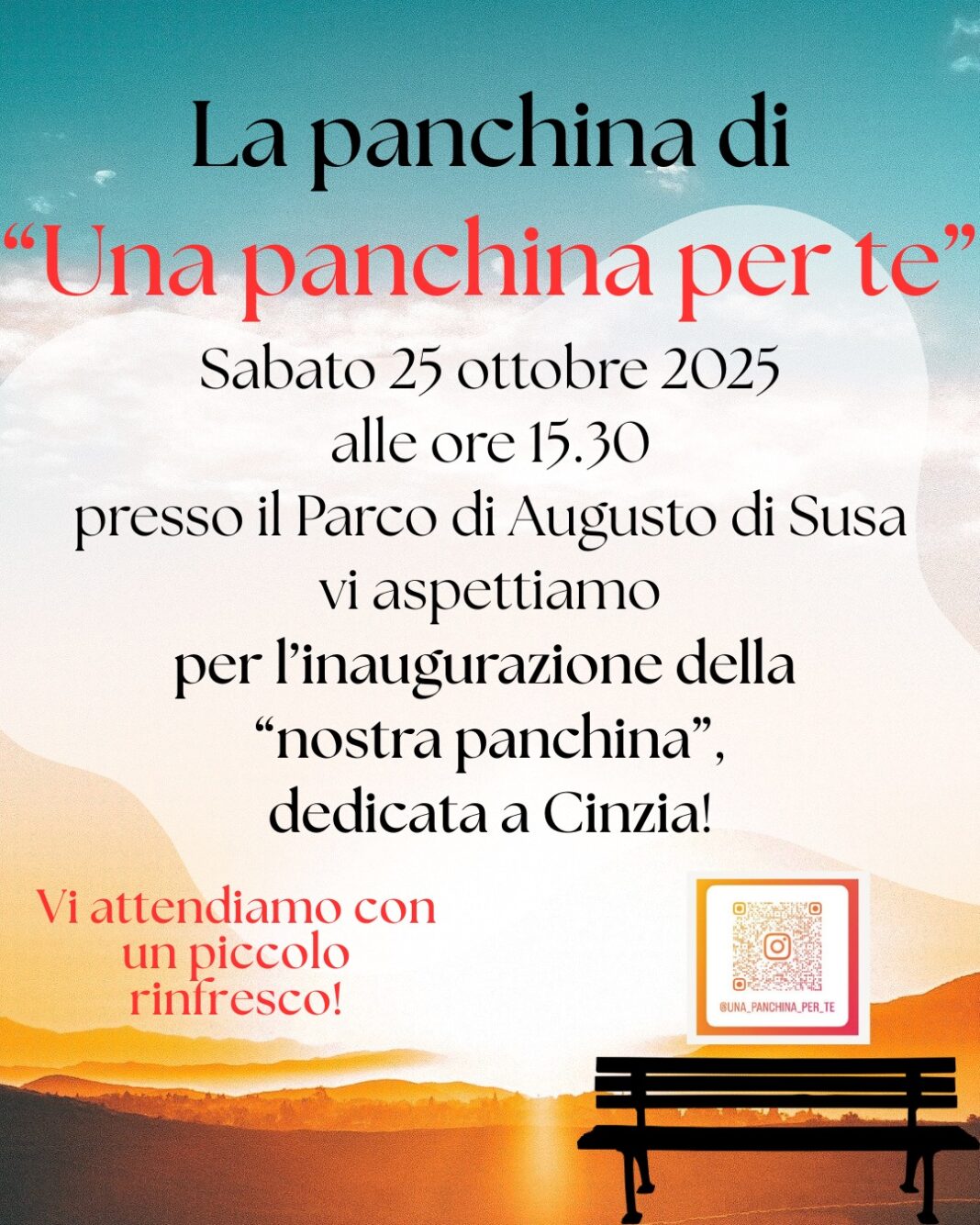 Sul proprio profilo social, la Città di Susa ha voluto ricordare l’evento con un messaggio pieno di affetto: «Ieri, sabato 25 ottobre, nei giardini del parco di Augusto a Susa, si è tenuta l’inaugurazione della panchina dedicata a Cinzia Bertolla, splendida ragazza di 25 anni scomparsa a causa di un tumore. L’Amministrazione Comunale ha risposto con commozione e affetto alla richiesta di Mariella, la mamma straordinaria di Cinzia, di poter “adottare” la panchina su cui era solita soffermarsi per fare alcuni dei suoi molteplici book fotografici. Cinzia ha così lasciato tantissime sue immagini alla mamma e da oggi in poi quella panchina, grazie al suo insegnamento, potrà essere luogo di incontro, riflessione ed eventi. Una panchina per Te».
