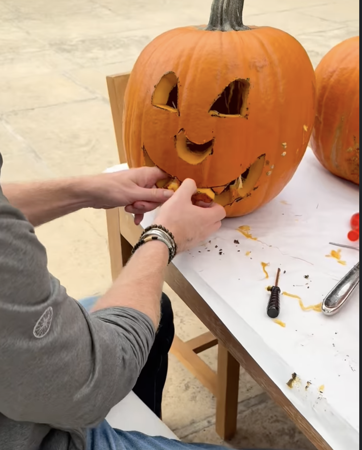 Il racconto visivo procede come un piccolo film familiare. Meghan spinge un carretto di legno con la figlia seduta tra le zucche; Harry la osserva sorridendo, mentre intaglia una jack-o’-lantern accanto ai bambini. Doria, la nonna, partecipa alla scena, scolpendo una zucca al tavolo. Tutto è orchestrato con cura: la naturalezza studiata, i gesti quotidiani, la luce calda del pomeriggio. È la versione hollywoodiana del Mulino Bianco, dove ogni dettaglio è carico di significato simbolico — la famiglia, l’autenticità, la tradizione.