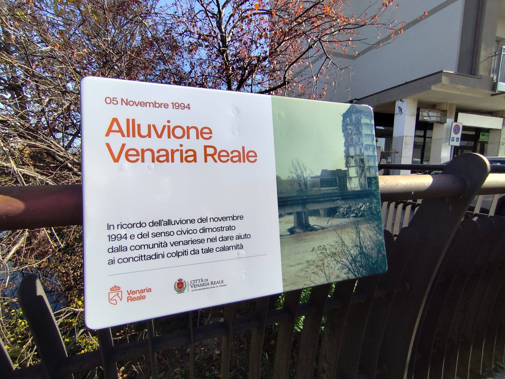 "In ricordo dell’alluvione del novembre 1994 e del senso civico dimostrato dalla comunità venariese nel dare aiuto ai concittadini colpiti da tale calamità".