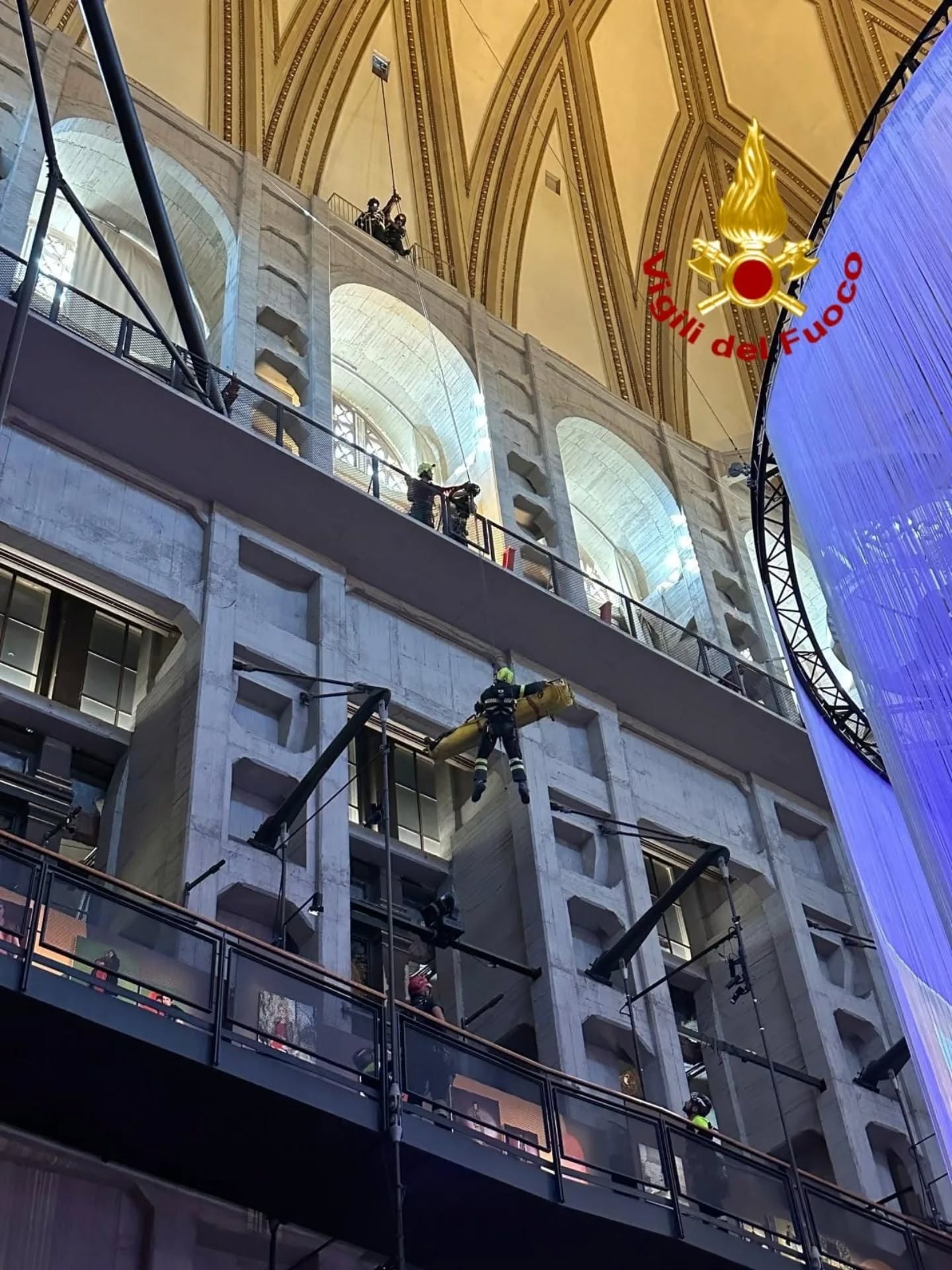 Un’altra simulazione di alto profilo ha riguardato il recupero in altezza (SAF): una complessa operazione di evacuazione di un figurante bloccato a 50 metri di quota all’interno della Mole Antonelliana di Torino, con il trasporto di una barella guidata su corda mediante tecniche Speleo-Alpino-Fluviali.