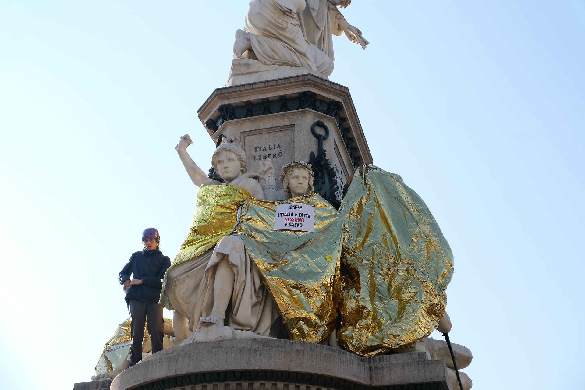 A parlare, da uno dei basamenti della statua, è Toni, uno degli attivisti saliti sull’opera: «Il pianeta continua a scaldarsi e le vittime e gli sfollati di catastrofi climatiche ad aumentare. È una crisi aggravata dalle diseguaglianze nella distribuzione della ricchezza, concentrata nelle mani di un’élite sempre più ristretta». Accanto, un altro militante indica il contesto urbano dell’azione: «In questa piazza ci sono un hotel di lusso e una banca d’affari: un contrasto simbolico tra chi accumula e chi subisce gli effetti di un sistema che brucia risorse e vite».
