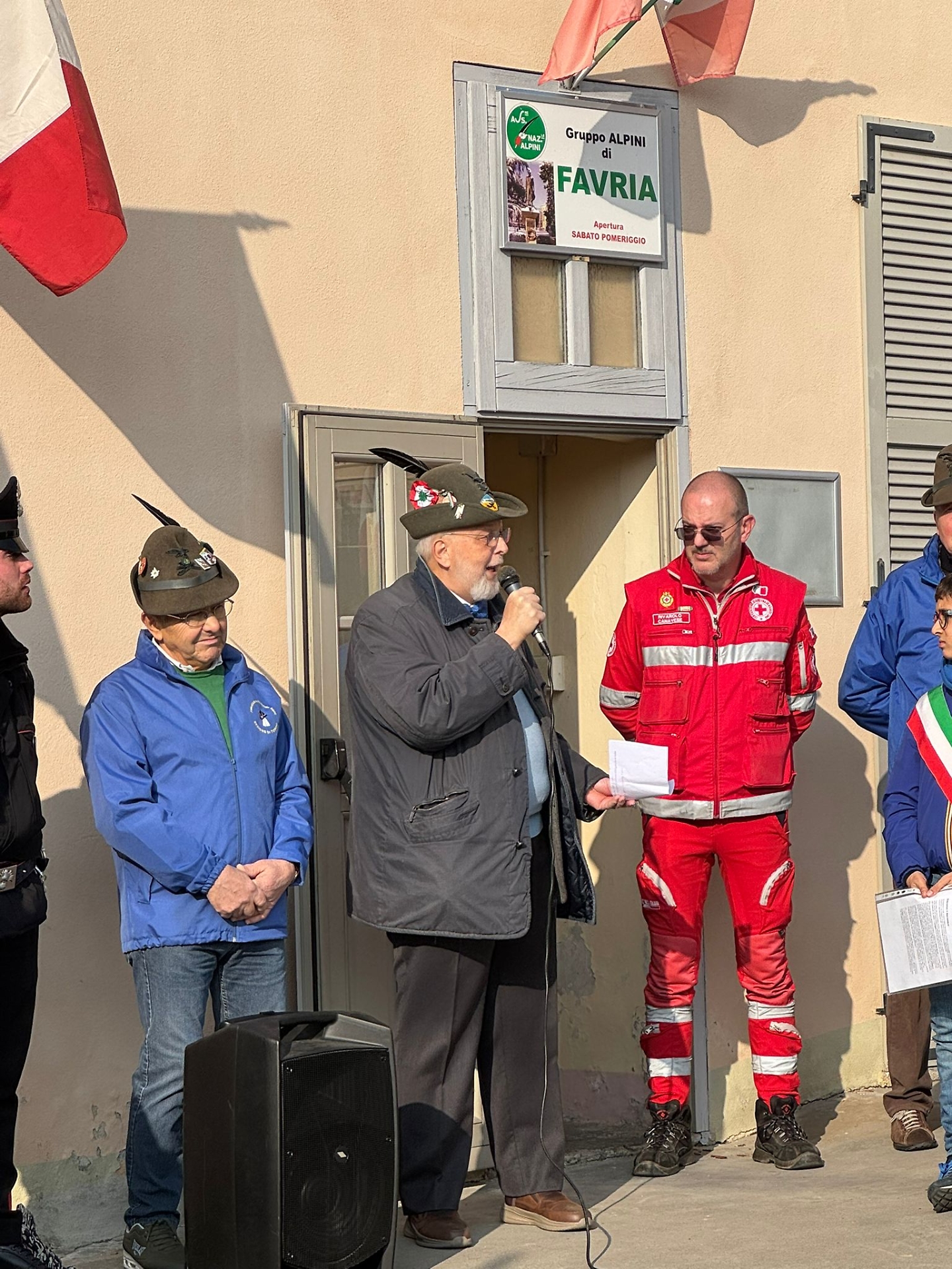 Poi, il momento più intenso della mattinata: l’intervento di Giorgio Cortese, relatore ufficiale della cerimonia. Con tono appassionato e profondità di pensiero, ha condotto i presenti in un vero e proprio viaggio nel tempo, ripercorrendo la storia della patria e del Gruppo Alpini di Favria, fondato nel 1924, attraverso le grandi svolte del secolo scorso: la Liberazione, la nascita della Repubblica, la ricostruzione, la caduta del Muro di Berlino. Ogni tappa, un simbolo. Ogni ricordo, un monito. “La pace non è assenza di guerra, ma impegno quotidiano per la giustizia e la fratellanza”, ha affermato Cortese, suscitando una lunga e sentita ovazione. E ancora: “Ricordare non significa restare fermi nel passato, ma camminare insieme verso il futuro, portando nel cuore il sacrificio di chi ci ha preceduti come luce che illumina la strada della pace.”