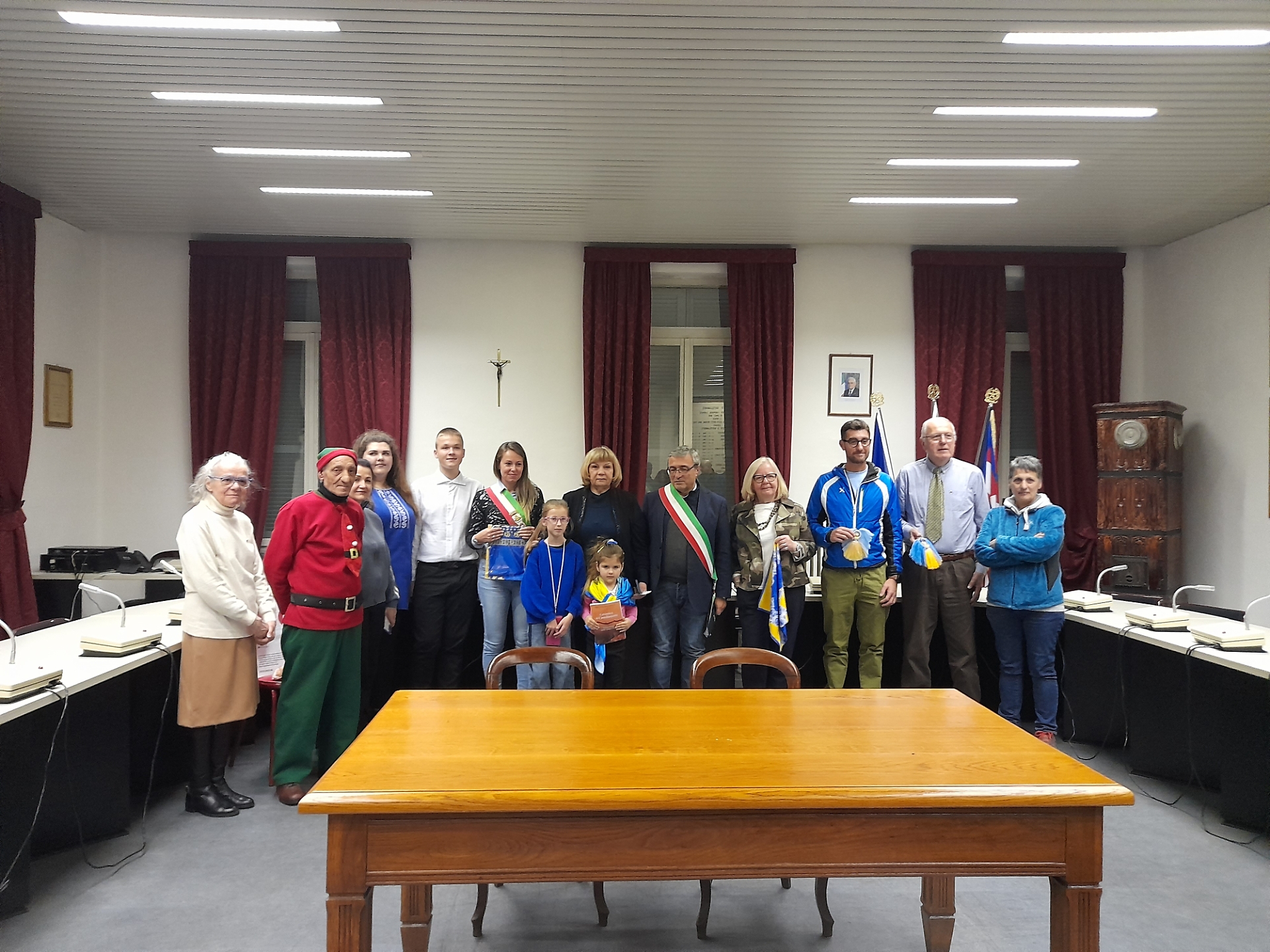 Così, dopo la visita al <Consolato>, gli ospiti sono stati accolti in sala consiliare. Insieme alla prima cittadina c’erano la Responsabile dell’Ufficio Cultura; due cantanti d’opera (la giovane professionista Julia Nesterenko ed il giovanissimo Oleksandr Shuhai, che si sono esibiti in un canto simbolo della resistenza all’invasore) e due bambine: una più grandicella, l’altra piccolina.