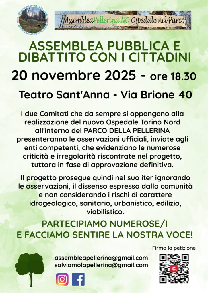 La mobilitazione contro il nuovo Ospedale Torino Nord previsto all’interno del Parco della Pellerina entra in una nuova fase. I Comitati cittadini che da tempo contestano la localizzazione dell’intervento hanno convocato un’assemblea pubblica e un dibattito aperto alla cittadinanza per giovedì 20 novembre, alle 18.30, al Teatro Sant’Anna di via Brione 40, a Torino. Un appuntamento che vuole portare davanti al pubblico le osservazioni ufficiali già inviate agli enti competenti, nel tentativo di rendere chiari tutti i punti considerati critici.