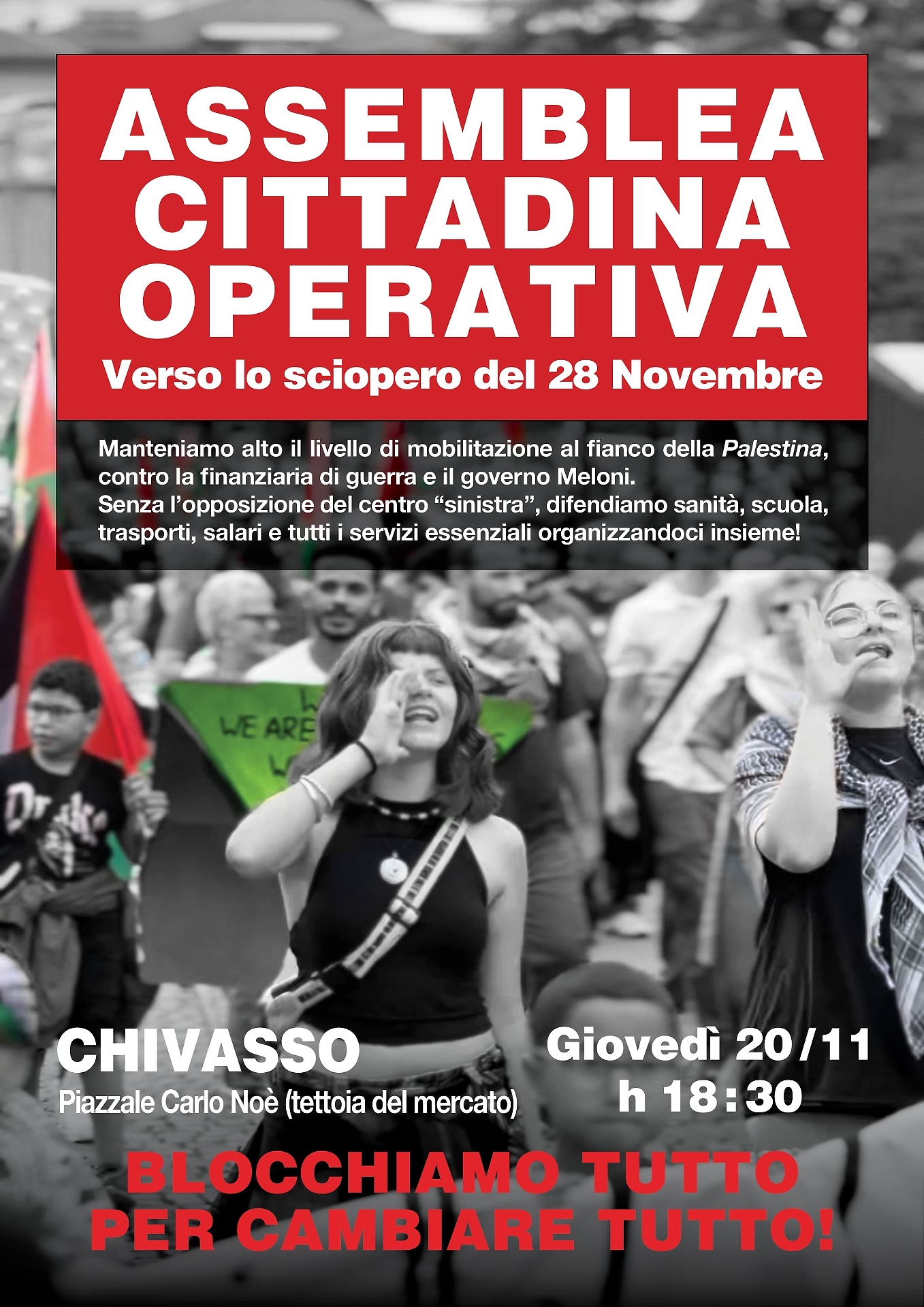 A Chivasso si torna a parlare di politica vera, quella che nasce fuori dai palazzi e dentro le contraddizioni di un territorio che continua a perdere pezzi. Giovedì 20 novembre, sotto la tettoia del mercato, Potere al Popolo convoca un’assemblea cittadina “operativa”, un passaggio che il movimento definisce decisivo “verso lo sciopero generale del 28 novembre e la manifestazione nazionale del 29 novembre”. Un appuntamento che arriva dopo settimane di mobilitazioni che – dicono – hanno riportato in piazza numeri che “non si vedevano da decenni”.