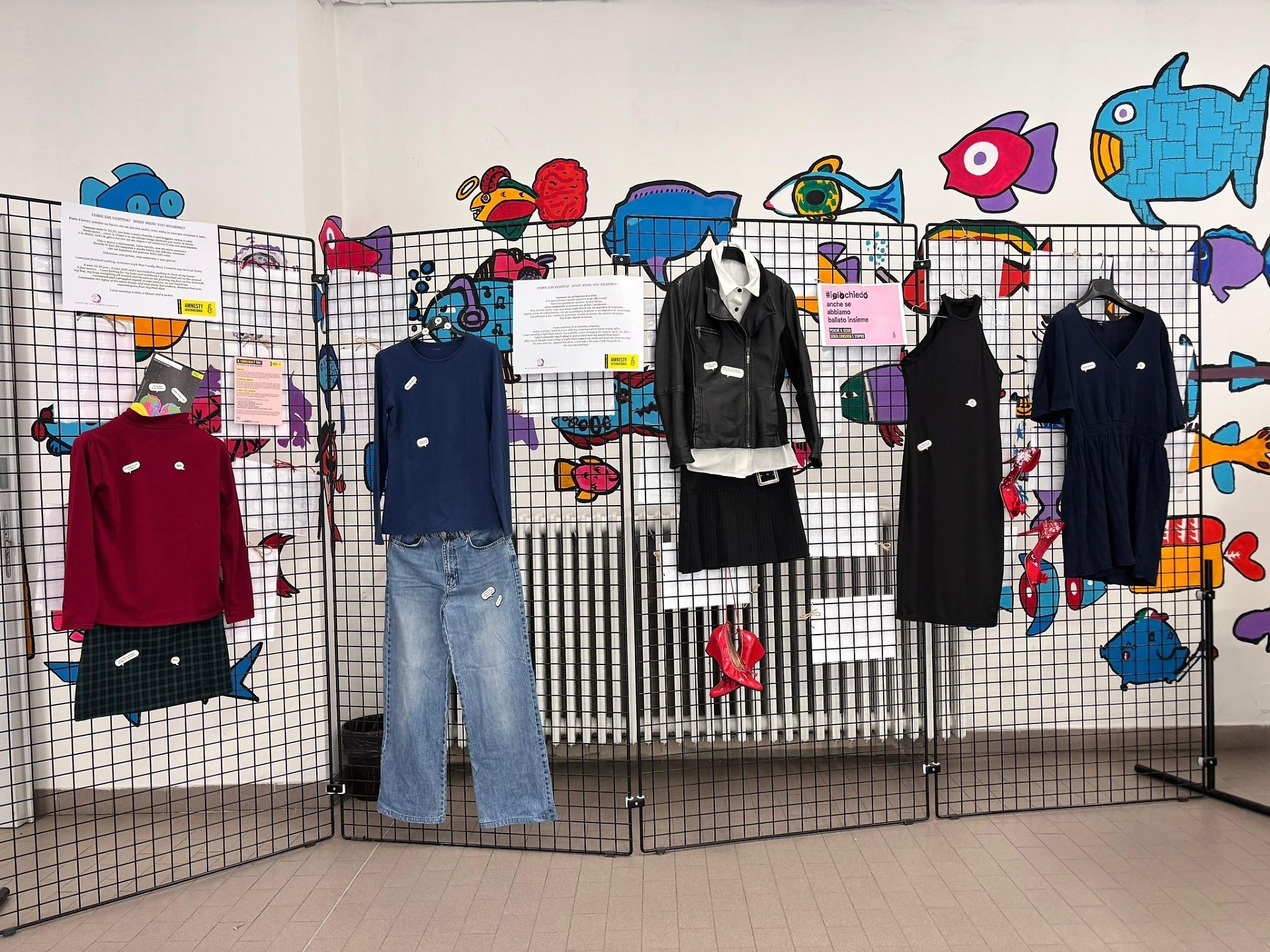 Il cuore della mostra è costituito dagli abiti ricostruiti a partire dai racconti di donne che hanno subito violenza. Capispalla, jeans, gonne, tute, pigiami, abiti da lavoro: vestiti quotidiani, comuni, che smontano un altro stereotipo, quello secondo cui l’aggressione sarebbe favorita dall’abbigliamento della vittima. L’esposizione non si è limitata a uno spazio unico, ma è stata pensata come percorso diffuso nei luoghi simbolici della comunità, così da raggiungere un pubblico più ampio e trasversale.