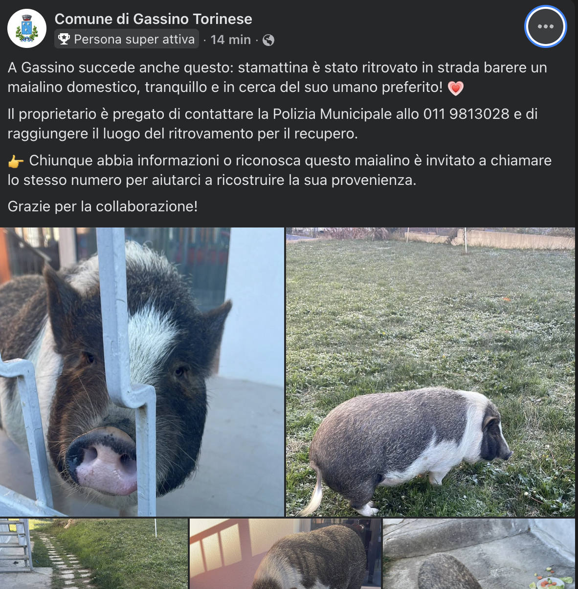 Adesso gli agenti lanciano l’appello ufficiale: il proprietario, o chiunque lo riconosca, è invitato a contattare la Municipale al numero 011 9813028 e a presentarsi per il recupero del maialino. Chi ha informazioni, chi lo ha visto scappare, chi gli ha offerto una carezza: ogni dettaglio può aiutare.