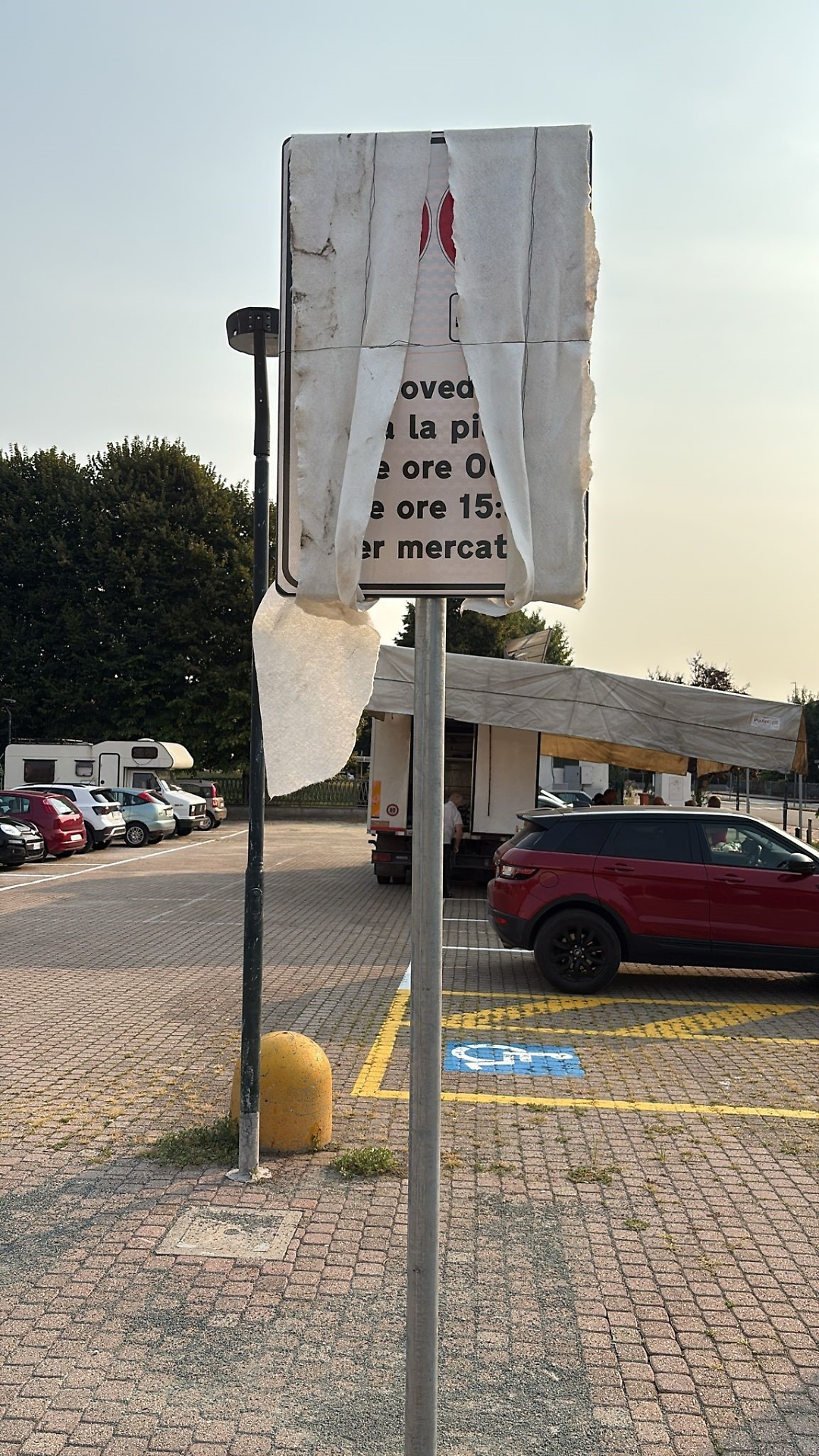 Secondo la minoranza, gli ambulanti sarebbero venuti a conoscenza del presunto trasferimento solo grazie ai clienti, mentre il Comune taceva. Intanto in piazza compariva il nuovo divieto di sosta del giovedì, installato proprio per accogliere il mercato “rilanciato”. Oggi quel cartello è coperto, come se volesse nascondere l’anticipo di un film mai uscito.