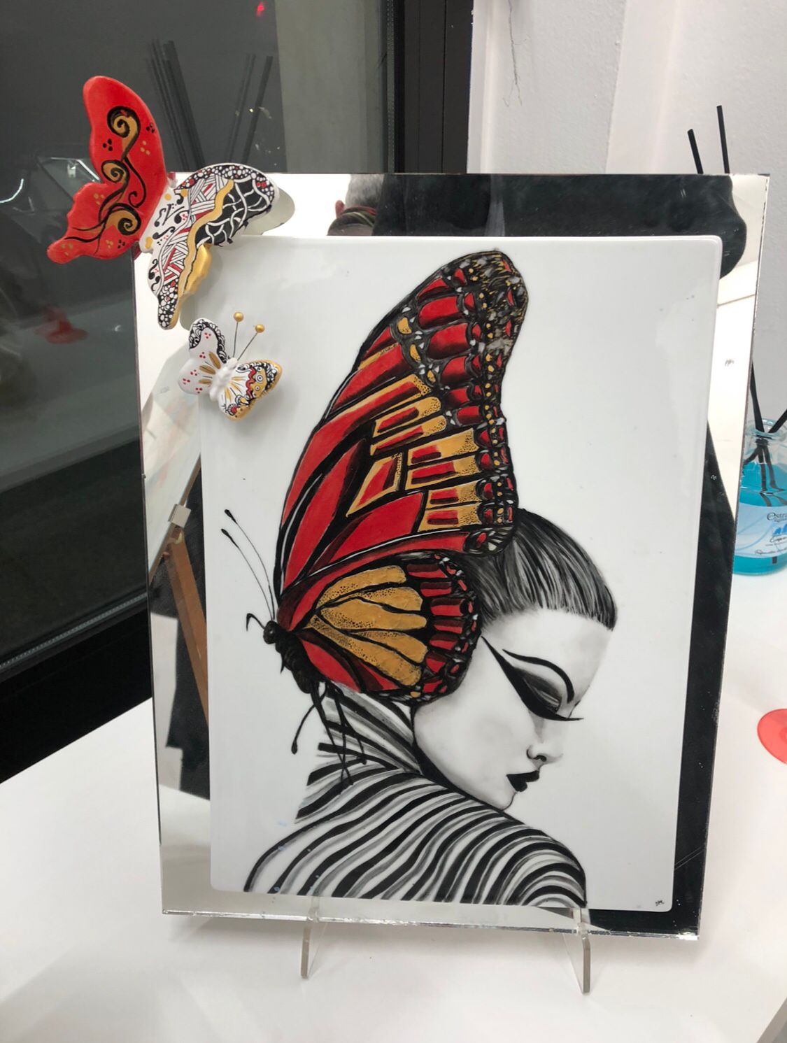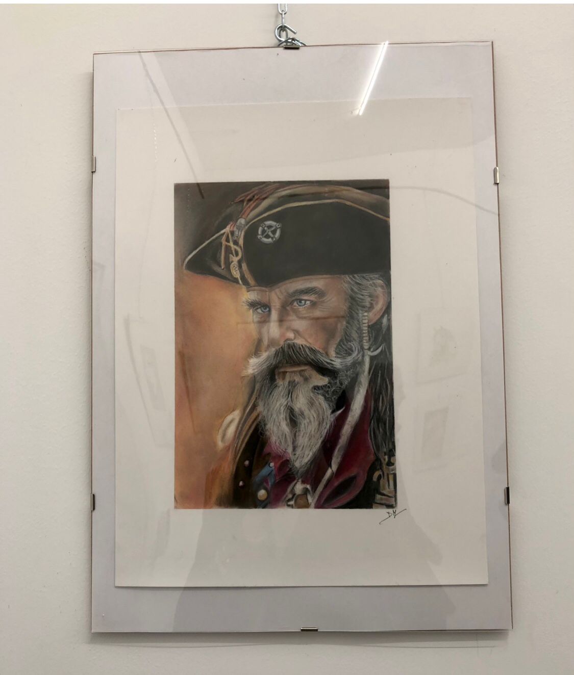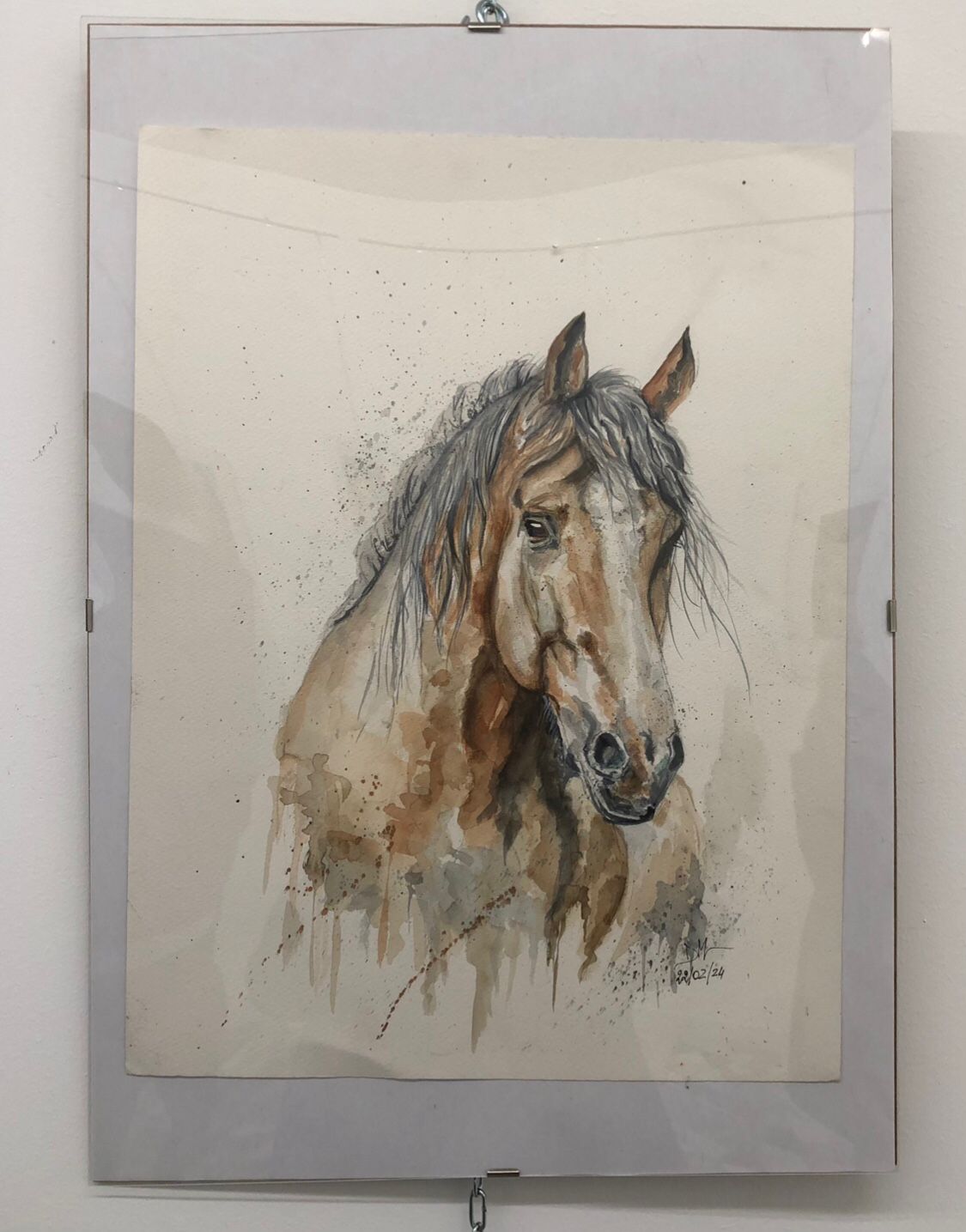 Martini lavora con pastelli, acquerelli e carbotelli colorati, muovendosi dentro un iperrealismo che non scivola mai nell’ostentazione, ma cerca l’essenza dei soggetti. Gli sguardi femminili, nitidi come vetro e profondi come ferite, sono tra le opere più osservate: volti avvolti da veli, pelle che sembra respirare, iridi che trattengono una storia taciuta. Quel tipo di ritratto che non chiede interpretazioni, perché ti guarda prima di essere guardato. Accanto a loro, l’immagine del pirata dagli occhi glaciali, il profilo elegante della donna-farfalla, il cavallo costruito attraverso una danza di acquerelli e macchie controllate: opere che rivelano una precisione quasi chirurgica nel modellare la luce.