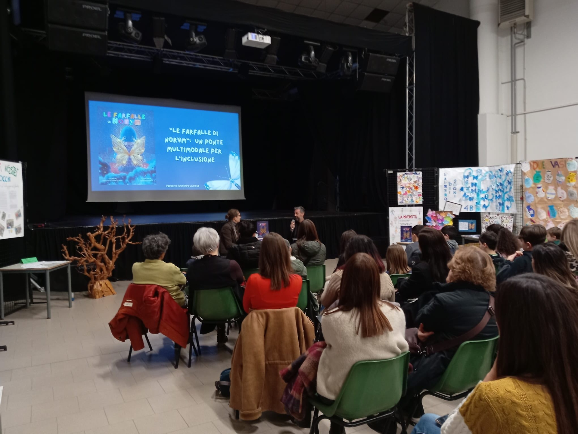 Tra i momenti della giornata anche la presentazione dell’albo illustrato “Le farfalle di Norym”, scritto da Federico Giuseppe La Rosa, per molti ex studenti e famiglie un volto familiare, perché per anni ha insegnato proprio in questo Istituto. In un dialogo affettuoso guidato dalla docente Fiorella Miotti, l’autore ha raccontato com’è nata Norym, questa bambina che ama le farfalle e che, in un sogno, immagina se stessa e i suoi compagni dotati di ali meravigliose.