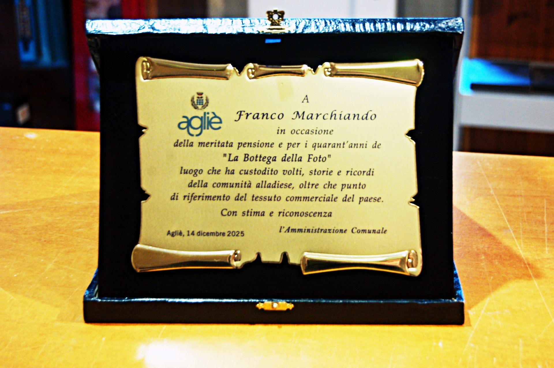 Le serrande si abbasseranno tra pochi giorni, ma l’immagine resterà impressa a lungo. Ad Agliè, dove La Bottega della Foto ha rappresentato per quarant’anni la stanza della memoria collettiva, la comunità ha scelto di dire grazie a Franco Marchiando nel modo più semplice e più autentico: un riconoscimento pubblico, consegnato in municipio, e una dedica che riassume una vita di lavoro, dedizione e sguardo attento sul paese.