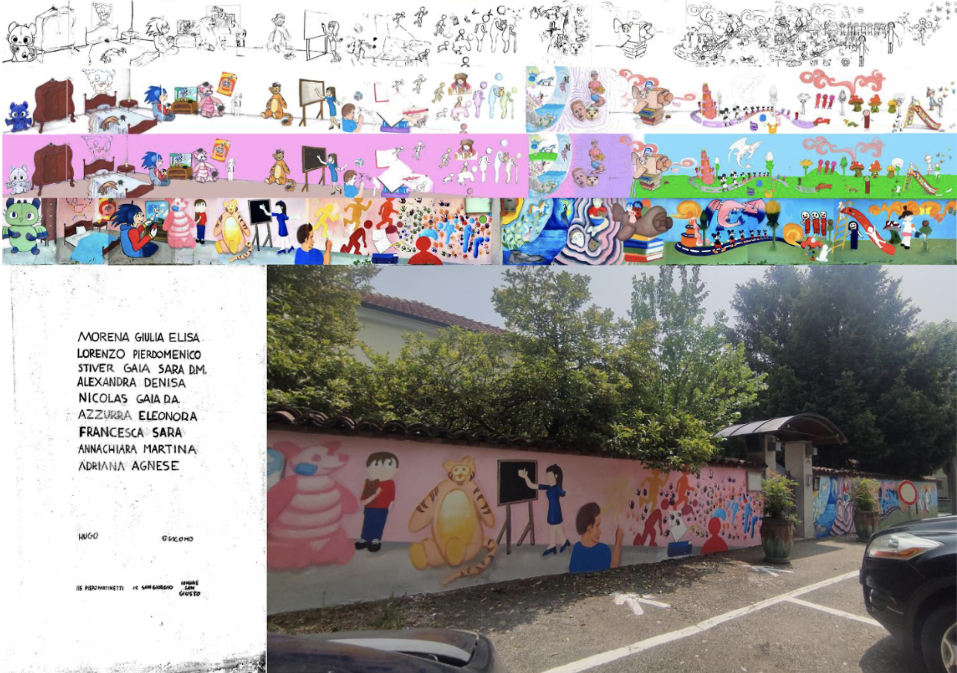 Il murales è oggi visibile sulla parete esterna della Scuola Primaria di San Giusto, quella che si affaccia direttamente sulla strada. L’intervento si sviluppa in due parti quasi simmetriche, separate dall’ingresso dell’edificio scolastico, come se l’arte accogliesse chi entra e chi passa, invitando a fermarsi e guardare. Le immagini sono il risultato di un lungo lavoro di ricerca formale, grafica e concettuale, condotto dagli studenti dell’Artistico insieme ai bambini, in un dialogo continuo tra idee, segni e immaginari.