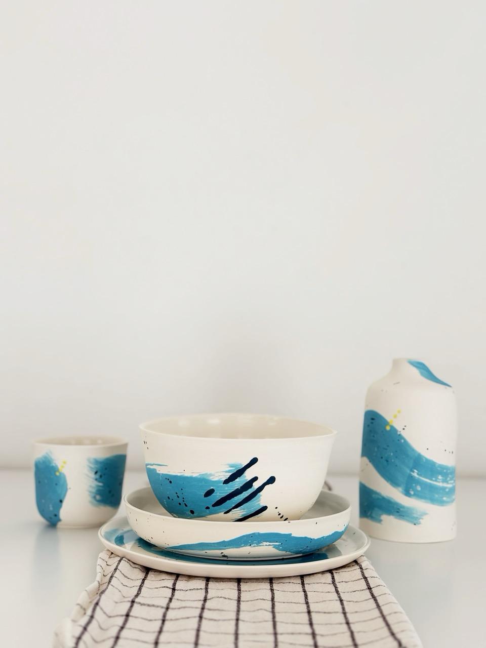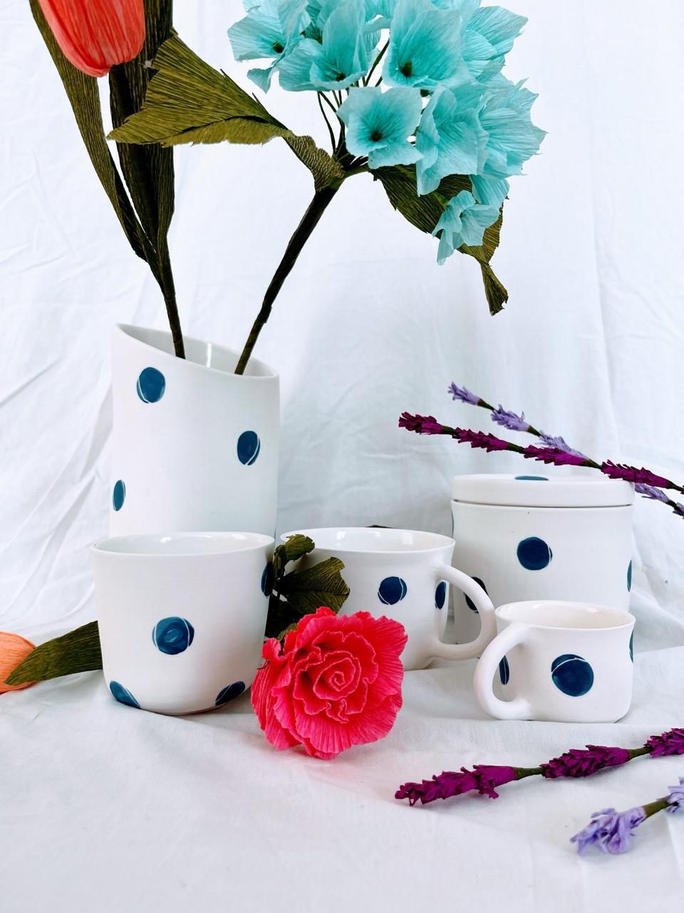 Le sue creazioni seguono questa linea: forme essenziali, decorate con fiori, foglie, pois e scritte, oggetti pensati per l’uso quotidiano – una tazza, un piatto, un gioiello – capaci di trasformare un’abitudine in un momento riconoscibile.