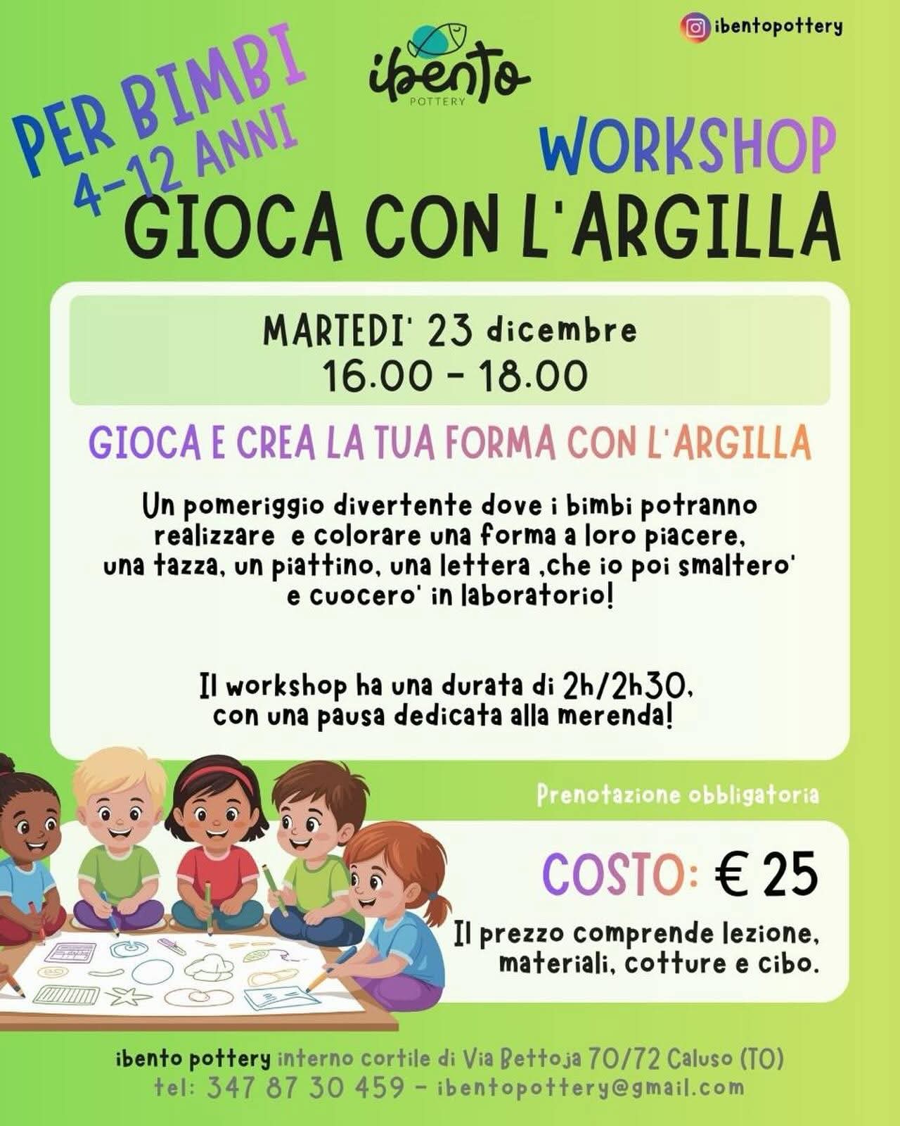 iBento Pottery è anche uno spazio aperto alla condivisione. Martedì 23 dicembre, dalle 16 alle 18.30, ospiterà il workshop per bambini “Gioca e crea la tua forza con l’argilla”. I partecipanti potranno modellare e colorare una forma a scelta – una tazza, un piattino o una lettera – che verrà poi smaltata e cotta in laboratorio. Il costo, 25 euro, comprende la lezione, i materiali, le cotture e una merenda.