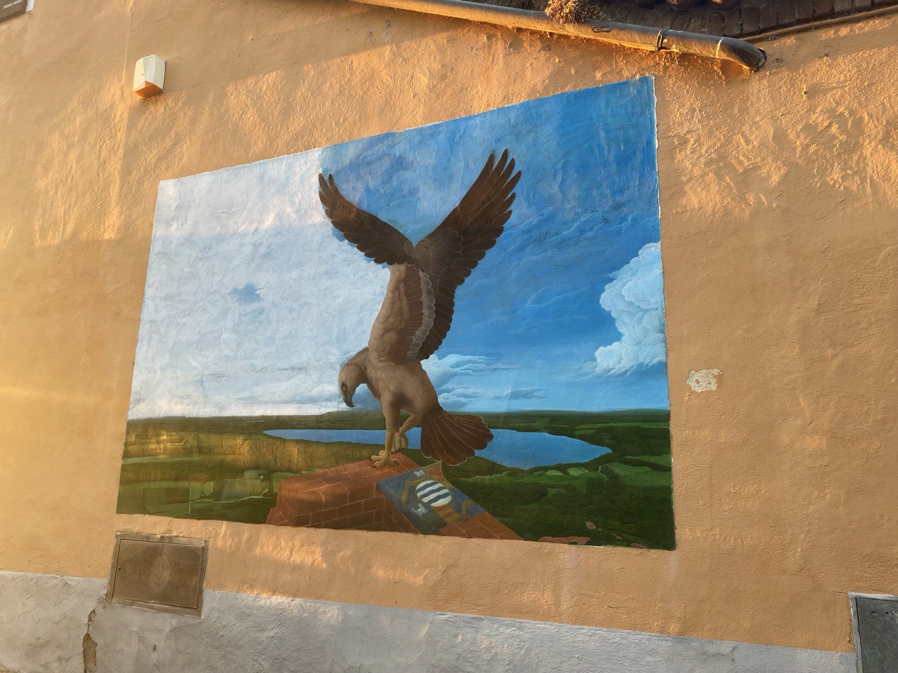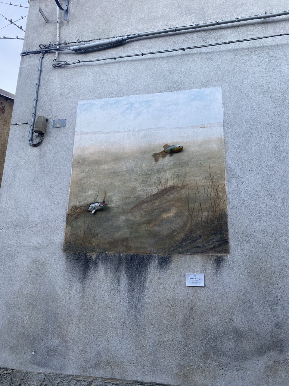 Il lago, però, a Candia non è solo leggenda. È un ecosistema vivo, pulsante, che entra nel paese attraverso i muri. Passeggiando tra le vie si incontra un grande rapace che domina il paesaggio dall’alto, quasi a sorvegliare tetti e cortili. Poco più avanti, in un tondo che ricorda un oblò aperto sulla natura, un volatile spiega le ali: un’immagine familiare per chi frequenta il Parco Naturale. C’è spazio anche per suggestioni impressioniste, come la parete dedicata alle ninfee bianche, immerse nella luce morbida delle zone umide. E poi la sorpresa dello sguardo “sott’acqua”: in “Scambio di energia” l’osservatore viene trascinato sul fondale del lago, dove i pesci sembrano emergere dal muro con un sorprendente effetto tridimensionale, a ricordare che la vita del Parco continua anche sotto la superficie.