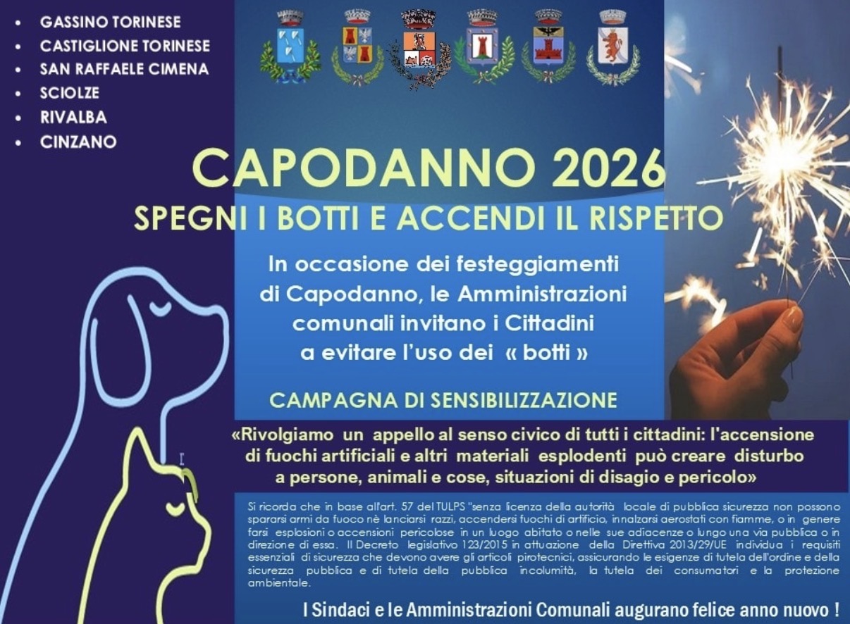 C’è un’immagine che ogni anno si ripete: un petardo che scoppia in strada, un cane che tenta di scappare, una persona che sobbalza, un’ambulanza che passa in lontananza. E poi la solita domanda, che non ha più nulla di rituale: è davvero necessario festeggiare così? In queste ore, tra Gassino Torinese, Castiglione Torinese, San Raffaele Cimena, Sciolze, Rivalba e Cinzano, l’argomento è tornato a occupare bacheche e conversazioni, ma con un passo in più: una campagna comune, con un messaggio diretto e poco accomodante, «Spegni i botti e accendi il rispetto».
