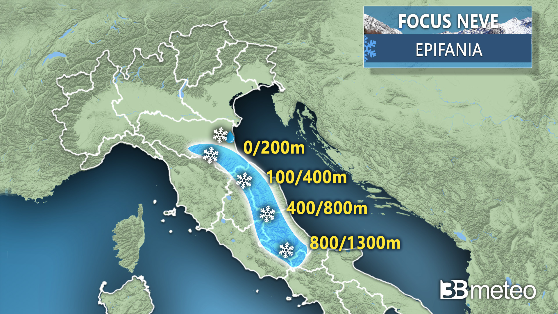 Si aprirà così una fase di freddo e maltempo: già da lunedì 5 gennaio piogge e temporali interesseranno in particolare le regioni del Centro-Sud, ma la fase più intensa è attesa tra l'Epifania e mercoledì 7 gennaio. Il marcato calo delle temperature potrebbe favorire nevicate fino in pianura o a bassissima quota, soprattutto su Lombardia centro-orientale, Veneto, Trentino-Alto Adige, Friuli Venezia Giulia, Emilia-Romagna e Marche.