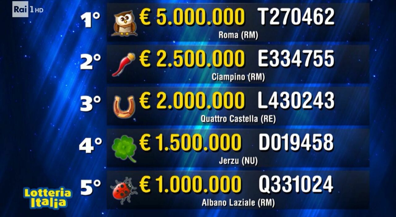 Il secondo premio da 2,5 milioni di euro è stato venduto in un locale all’interno dell’aeroporto di Ciampino, mentre il terzo premio da 2 milioni di euro è stato acquistato al Bar Le Tabaccherie Le Ginestre di Quattro Castella, in provincia di Reggio Emilia. La quarta vincita da 1,5 milioni di euro è stata centrata a Jerzu, in provincia di Nuoro, mentre il già citato quinto premio da 1 milione di euro è finito ad Albano Laziale.