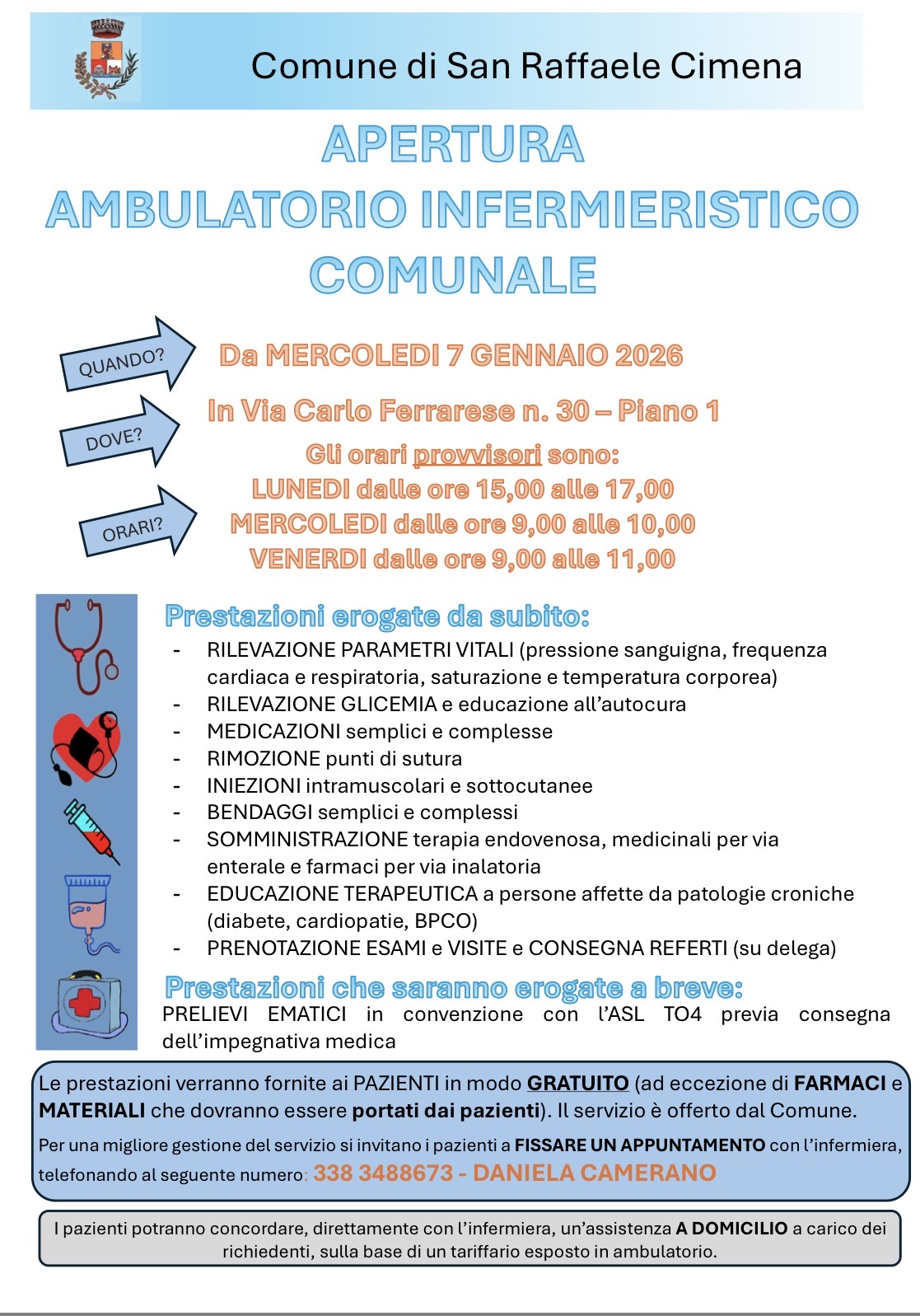 Per garantire una gestione ordinata ed efficace del servizio, i cittadini sono invitati a fissare un appuntamento contattando direttamente l’infermiera Daniela Camerano al numero 338.3488673. Con lei sarà possibile concordare anche interventi di assistenza domiciliare, che resteranno a carico dei richiedenti e saranno regolati da un tariffario esposto in ambulatorio.