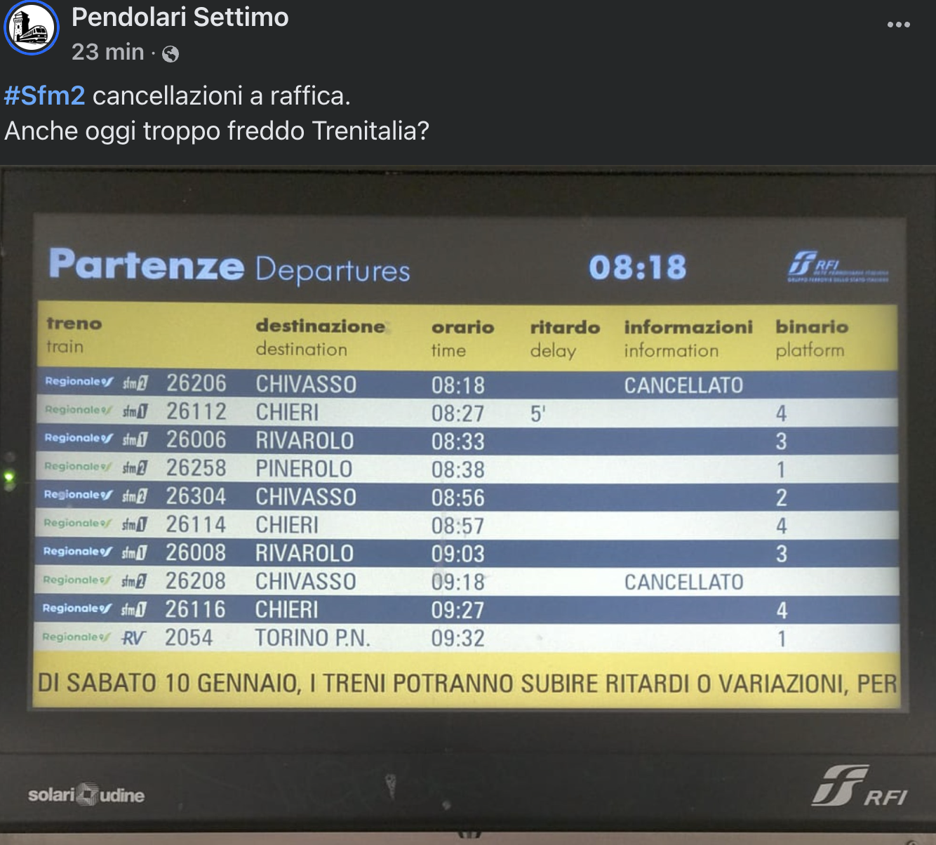 Un quadro che ha inevitabilmente riacceso il dibattito tra i pendolari. Sulla pagina Facebook “Pendolari Settimo” alcuni utenti hanno commentato con ironia e sarcasmo, chiedendosi se anche oggi la responsabilità fosse da attribuire al freddo, nonostante il termometro racconti un’altra realtà. Una reazione che va oltre la battuta: è il segnale di una fiducia che si incrina, di fronte a spiegazioni percepite come ripetitive e sempre meno convincenti.