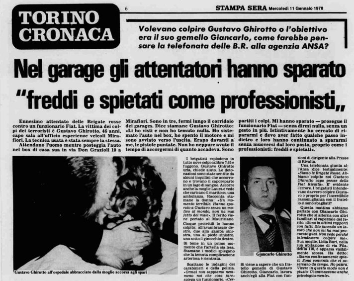 Quando la rivendicazione dell’attentato al quattordicesimo uomo della FIAT colpito durante gli anni di piombo arriva all’ANSA, qualcosa, da subito, suona strano. La telefonata, infatti, fa riferimento al “capo fabbricazione alla FIAT Rivalta” ma l’uomo rimasto a terra, Gustavo Ghirotto, di mestiere è caposala all’ufficio esperienze veicoli a Mirafiori.