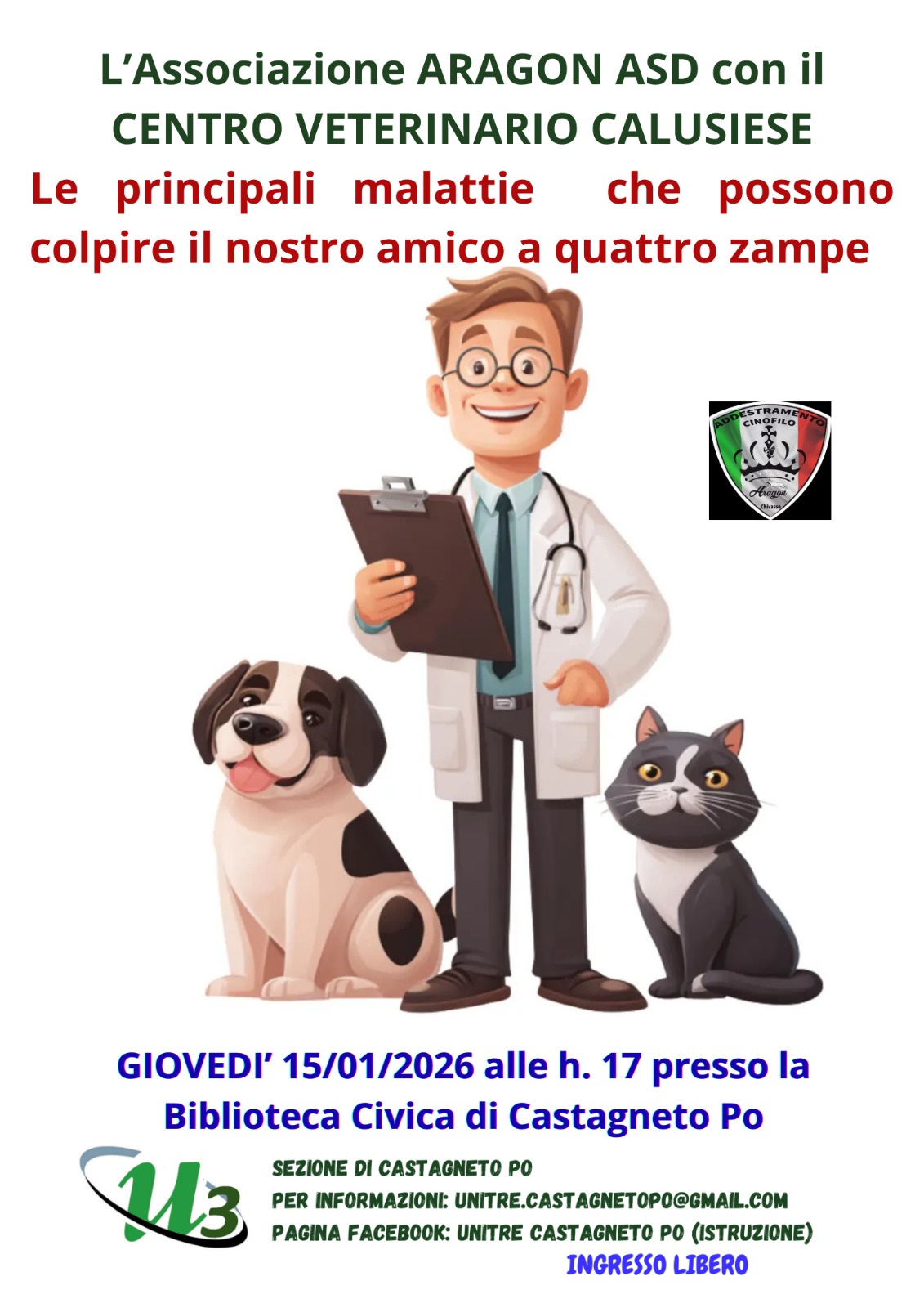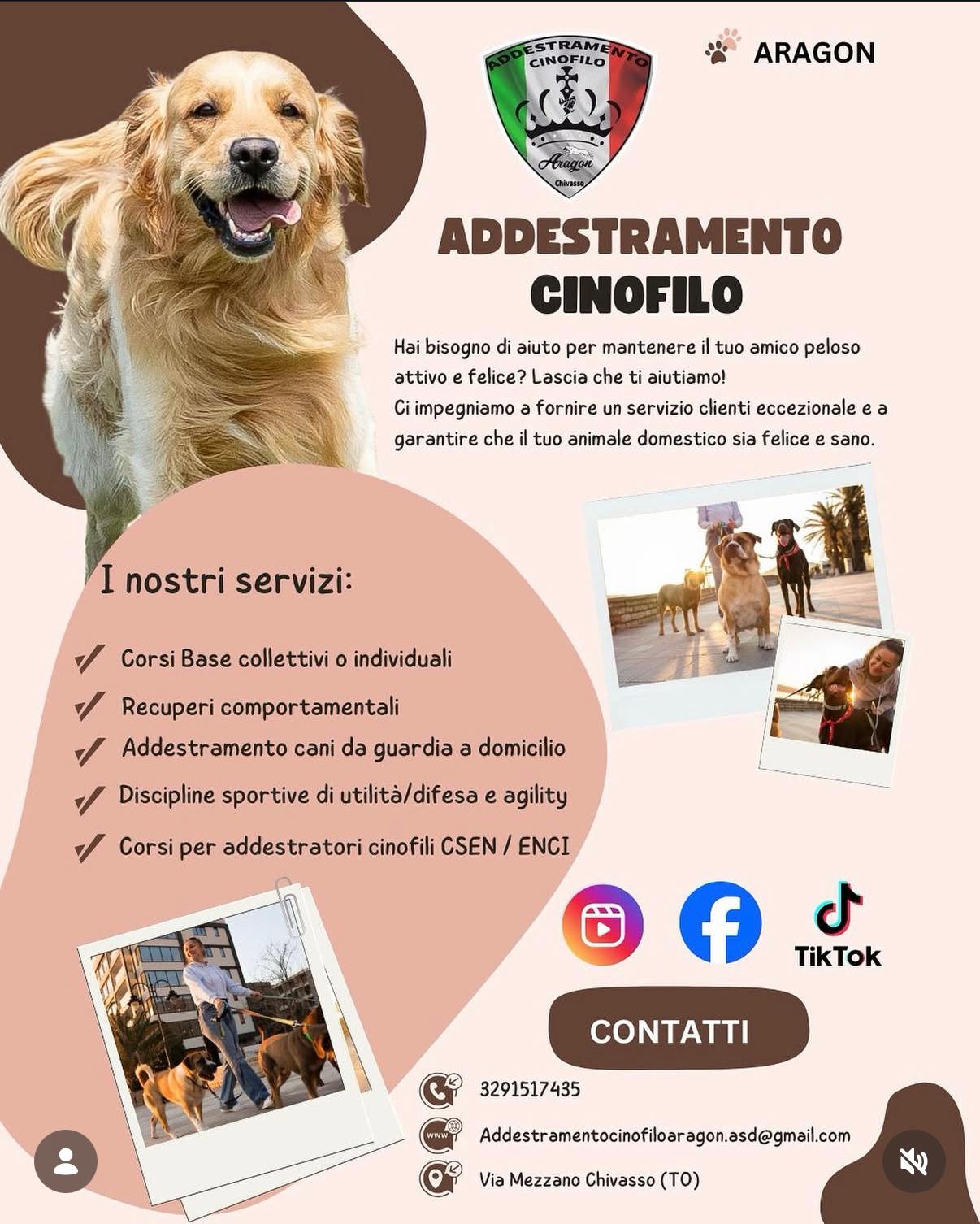 Per informazioni e contatti: Centro Addestramento Cinofilo Aragon ASD – telefono 329 1517435 – email addestramentocinofiloaragon.asd@gmail.com.