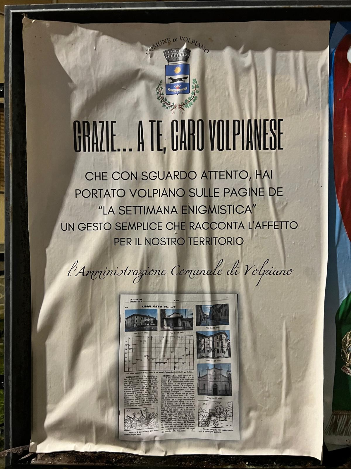 Non stupisce allora che il Comune abbia voluto ringraziarlo pubblicamente. Nei giorni successivi, Volpiano si è tappezzata di manifesti: “Grazie… a te caro Volpianese, che con sguardo attento hai portato Volpiano sulle pagine de La Settimana Enigmistica. Un gesto semplice che racconta l’affetto per il nostro territorio”, firmato dall’amministrazione comunale.